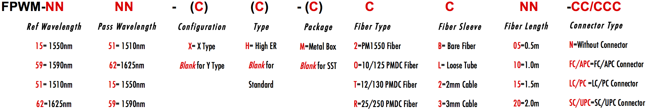 FPWM 1510nm C 1550nm Band Supervisory PM WDM Filter Wavelength division filtre filtro Multiplexer Demux Combiner Divide Splitter PM1550 LMA 8/125um 10/125um 10/130um 12/130um 20/125um 20/130um 25/250um 25/300um 30/250um PMSC Single Clad Cladding PMDC Double Clad 3-port Y Type 4-port X Type Polarization Maintaining PM Extinction Ratio ER Panda