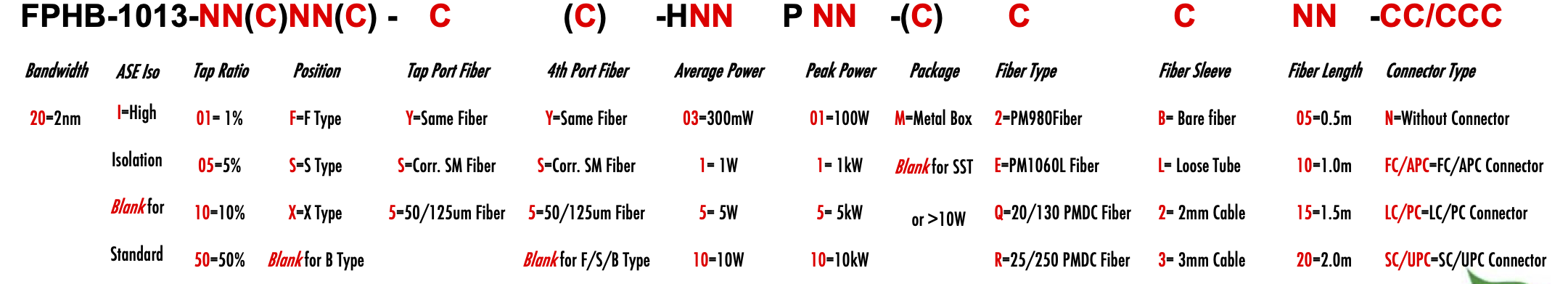 FPHB 1013nm Singlemode PM Fiber Bandpass Filter Tap coupler splitter Hybrid Bandwidth 2.0nm optical fiber bandpass filter with tap coupler or splitter hybrid device or bandstop filter Glasfaser-Bandpassfilter mit Abzweigkoppler oder Splitter-Hybridgerät oder Bandsperrfilter Filtro de paso de banda de fibra óptica con acoplador de grifo o dispositivo híbrido divisor o filtro de banda filtre passe-bande à fibre optique avec coupleur de prise ou dispositif hybride séparateur ou filtre coupe-bande optinen kuitukaistanpäästösuodatin, jossa on väliliitin tai jakajahybridilaite tai kaistanstop-suodatin filtro passa-banda de fibra óptica com acoplador de torneira ou dispositivo híbrido divisor ou filtro de parada de banda ?wiat?owodowy filtr pasmowo-przepustowy z hybrydowym urz?dzeniem sprz?gaj?cym lub rozdzielaczem lub filtrem pasmowym optisk fiber båndpassfilter med tappkopler eller splitter hybridenhet eller båndstoppfilter filtro passa banda in fibra ottica con accoppiatore di presa o dispositivo ibrido sdoppiatore o filtro elimina banda glasvezelbanddoorlaatfilter met kraankoppeling of splitter hybride apparaat of bandstopfilter pásmový filtr s optickým vláknem s odbo?ovacím vazebním ?lenem nebo rozbo?ovacím hybridním za?ízením nebo pásmovým filtrem PM980 PM980XP PM980HP LMA 6/125um 10/125um 10/130um 12/130um 15/125um 15/130um 20/125um 20/130um 25/250um 30/250um SC Single Clad Cladding DC Double Clad or large mode area fiber fibre à simple gaine ou fibre à double gaine ou fibre à grande zone de mode ingle Clad-Faser oder Double Clad-Faser oder Large-Mode-Area-Faser ibra con revestimiento simple o fibra con revestimiento doble o fibra de área modal grande fibra de revestimento simples ou fibra de revestimento duplo ou fibra de área de modo grande ibra a rivestimento singolo o fibra a doppio rivestimento o fibra a grande area modale yksikerroksinen kuitu tai kaksinkertainen kuitu tai suurimuotoinen kuitu 2-port D Type 3-port Y Type 4-port X Type Type D à 2 ports Type Y à 3 ports Type X à 4 ports -Port-D-Typ 3-Port-Y-Typ 4-Port-X-Typ Tipo D de 2 puertos Tipo Y de 3 puertos Tipo X de 4 puertos Tipo D de 2 portas Tipo Y de 3 portas Tipo X de 4 portas ipo D a 2 porte Tipo Y a 3 porte Tipo X a 4 porte 2-porttinen D-tyyppi 3-porttinen Y-tyyppi 4-porttinen X-tyyppi Polarization Maintaining PM Extinction Ratio ER Panda tie maintien de la polarisation fibre panda ou cravate avec taux d'extinction polarisationserhaltende Panda- oder Bindefaser mit Extinktionsverhältnis polarización manteniendo panda o fibra de amarre con relación de extinción polarização mantendo a fibra panda ou tie com taxa de extinção polarizzazione mantenendo panda o legare fibra con rapporto di estinzione olarisaatiota ylläpitävä panda- tai sidekuitu ekstinktiosuhteella