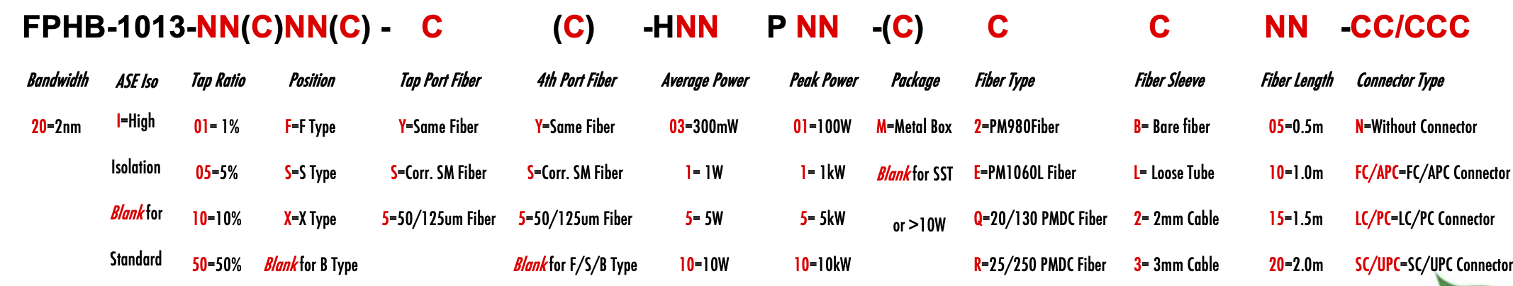 FPHB 1014nm Singlemode PM Fiber Bandpass Filter Tap coupler splitter Hybrid Bandwidth 4.0nm 4nm optical fiber bandpass filter with tap coupler or splitter hybrid device or bandstop filter Glasfaser-Bandpassfilter mit Abzweigkoppler oder Splitter-Hybridgerät oder Bandsperrfilter Filtro de paso de banda de fibra óptica con acoplador de grifo o dispositivo híbrido divisor o filtro de banda filtre passe-bande à fibre optique avec coupleur de prise ou dispositif hybride séparateur ou filtre coupe-bande optinen kuitukaistanpäästösuodatin, jossa on väliliitin tai jakajahybridilaite tai kaistanstop-suodatin filtro passa-banda de fibra óptica com acoplador de torneira ou dispositivo híbrido divisor ou filtro de parada de banda ?wiat?owodowy filtr pasmowo-przepustowy z hybrydowym urz?dzeniem sprz?gaj?cym lub rozdzielaczem lub filtrem pasmowym optisk fiber båndpassfilter med tappkopler eller splitter hybridenhet eller båndstoppfilter filtro passa banda in fibra ottica con accoppiatore di presa o dispositivo ibrido sdoppiatore o filtro elimina banda glasvezelbanddoorlaatfilter met kraankoppeling of splitter hybride apparaat of bandstopfilter pásmový filtr s optickým vláknem s odbo?ovacím vazebním ?lenem nebo rozbo?ovacím hybridním za?ízením nebo pásmovým filtrem PM980 PM980XP PM980HP LMA 6/125um 10/125um 10/130um 12/130um 15/125um 15/130um 20/125um 20/130um 25/250um 30/250um SC Single Clad Cladding DC Double Clad or large mode area fiber fibre à simple gaine ou fibre à double gaine ou fibre à grande zone de mode ingle Clad-Faser oder Double Clad-Faser oder Large-Mode-Area-Faser ibra con revestimiento simple o fibra con revestimiento doble o fibra de área modal grande fibra de revestimento simples ou fibra de revestimento duplo ou fibra de área de modo grande ibra a rivestimento singolo o fibra a doppio rivestimento o fibra a grande area modale yksikerroksinen kuitu tai kaksinkertainen kuitu tai suurimuotoinen kuitu 2-port D Type 3-port Y Type 4-port X Type Type D à 2 ports Type Y à 3 ports Type X à 4 ports -Port-D-Typ 3-Port-Y-Typ 4-Port-X-Typ Tipo D de 2 puertos Tipo Y de 3 puertos Tipo X de 4 puertos Tipo D de 2 portas Tipo Y de 3 portas Tipo X de 4 portas ipo D a 2 porte Tipo Y a 3 porte Tipo X a 4 porte 2-porttinen D-tyyppi 3-porttinen Y-tyyppi 4-porttinen X-tyyppi Polarization Maintaining PM Extinction Ratio ER Panda tie maintien de la polarisation fibre panda ou cravate avec taux d'extinction polarisationserhaltende Panda- oder Bindefaser mit Extinktionsverhältnis polarización manteniendo panda o fibra de amarre con relación de extinción polarização mantendo a fibra panda ou tie com taxa de extinção polarizzazione mantenendo panda o legare fibra con rapporto di estinzione olarisaatiota ylläpitävä panda- tai sidekuitu ekstinktiosuhteella