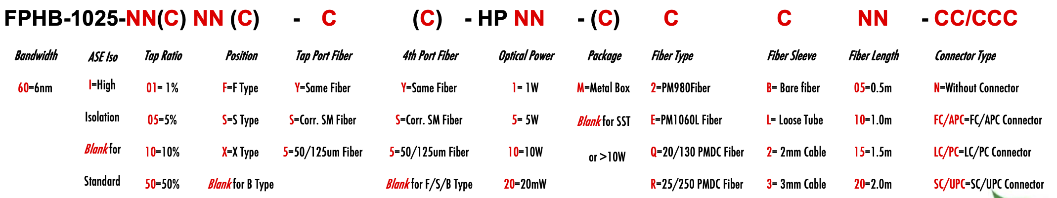 FPHB 1025nm Singlemode PM Fiber Bandpass Filter Tap coupler splitter Hybrid Bandwidth 2nm 2.0nm 6nm 6.0nm optical fiber bandpass filter with tap coupler or splitter hybrid device or bandstop filter Glasfaser-Bandpassfilter mit Abzweigkoppler oder Splitter-Hybridgerät oder Bandsperrfilter Filtro de paso de banda de fibra óptica con acoplador de grifo o dispositivo híbrido divisor o filtro de banda filtre passe-bande à fibre optique avec coupleur de prise ou dispositif hybride séparateur ou filtre coupe-bande optinen kuitukaistanpäästösuodatin, jossa on väliliitin tai jakajahybridilaite tai kaistanstop-suodatin filtro passa-banda de fibra óptica com acoplador de torneira ou dispositivo híbrido divisor ou filtro de parada de banda ?wiat?owodowy filtr pasmowo-przepustowy z hybrydowym urz?dzeniem sprz?gaj?cym lub rozdzielaczem lub filtrem pasmowym optisk fiber båndpassfilter med tappkopler eller splitter hybridenhet eller båndstoppfilter filtro passa banda in fibra ottica con accoppiatore di presa o dispositivo ibrido sdoppiatore o filtro elimina banda glasvezelbanddoorlaatfilter met kraankoppeling of splitter hybride apparaat of bandstopfilter pásmový filtr s optickým vláknem s odbo?ovacím vazebním ?lenem nebo rozbo?ovacím hybridním za?ízením nebo pásmovým filtrem PM980 PM980XP PM980HP LMA 6/125um 10/125um 10/130um 12/130um 15/125um 15/130um 20/125um 20/130um 25/250um 30/250um SC Single Clad Cladding DC Double Clad or large mode area fiber fibre à simple gaine ou fibre à double gaine ou fibre à grande zone de mode ingle Clad-Faser oder Double Clad-Faser oder Large-Mode-Area-Faser ibra con revestimiento simple o fibra con revestimiento doble o fibra de área modal grande fibra de revestimento simples ou fibra de revestimento duplo ou fibra de área de modo grande ibra a rivestimento singolo o fibra a doppio rivestimento o fibra a grande area modale yksikerroksinen kuitu tai kaksinkertainen kuitu tai suurimuotoinen kuitu 2-port D Type 3-port Y Type 4-port X Type Type D à 2 ports Type Y à 3 ports Type X à 4 ports -Port-D-Typ 3-Port-Y-Typ 4-Port-X-Typ Tipo D de 2 puertos Tipo Y de 3 puertos Tipo X de 4 puertos Tipo D de 2 portas Tipo Y de 3 portas Tipo X de 4 portas ipo D a 2 porte Tipo Y a 3 porte Tipo X a 4 porte 2-porttinen D-tyyppi 3-porttinen Y-tyyppi 4-porttinen X-tyyppi Polarization Maintaining PM Extinction Ratio ER Panda tie maintien de la polarisation fibre panda ou cravate avec taux d'extinction polarisationserhaltende Panda- oder Bindefaser mit Extinktionsverhältnis polarización manteniendo panda o fibra de amarre con relación de extinción polarização mantendo a fibra panda ou tie com taxa de extinção polarizzazione mantenendo panda o legare fibra con rapporto di estinzione olarisaatiota ylläpitävä panda- tai sidekuitu ekstinktiosuhteella