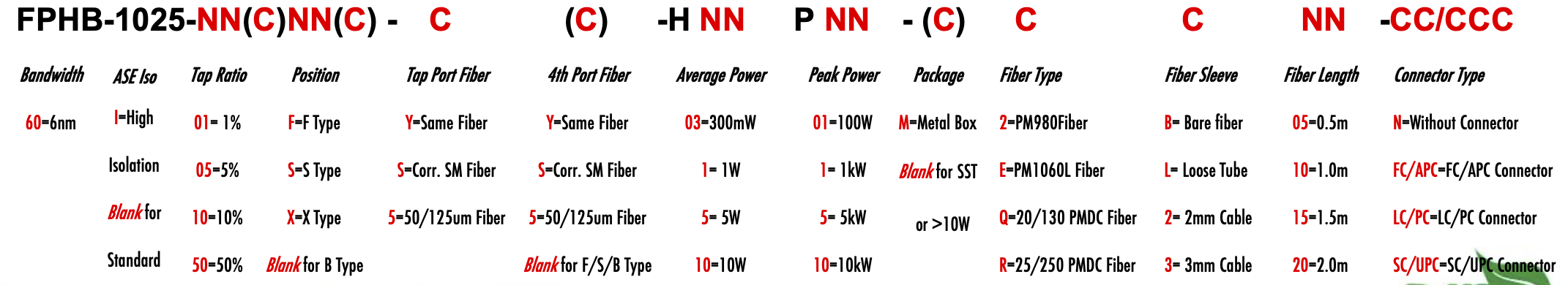 FPHB 1025nm Singlemode PM Fiber Bandpass Filter Tap coupler splitter Hybrid Bandwidth 2nm 2.0nm 6nm 6.0nm optical fiber bandpass filter with tap coupler or splitter hybrid device or bandstop filter Glasfaser-Bandpassfilter mit Abzweigkoppler oder Splitter-Hybridgerät oder Bandsperrfilter Filtro de paso de banda de fibra óptica con acoplador de grifo o dispositivo híbrido divisor o filtro de banda filtre passe-bande à fibre optique avec coupleur de prise ou dispositif hybride séparateur ou filtre coupe-bande optinen kuitukaistanpäästösuodatin, jossa on väliliitin tai jakajahybridilaite tai kaistanstop-suodatin filtro passa-banda de fibra óptica com acoplador de torneira ou dispositivo híbrido divisor ou filtro de parada de banda ?wiat?owodowy filtr pasmowo-przepustowy z hybrydowym urz?dzeniem sprz?gaj?cym lub rozdzielaczem lub filtrem pasmowym optisk fiber båndpassfilter med tappkopler eller splitter hybridenhet eller båndstoppfilter filtro passa banda in fibra ottica con accoppiatore di presa o dispositivo ibrido sdoppiatore o filtro elimina banda glasvezelbanddoorlaatfilter met kraankoppeling of splitter hybride apparaat of bandstopfilter pásmový filtr s optickým vláknem s odbo?ovacím vazebním ?lenem nebo rozbo?ovacím hybridním za?ízením nebo pásmovým filtrem PM980 PM980XP PM980HP LMA 6/125um 10/125um 10/130um 12/130um 15/125um 15/130um 20/125um 20/130um 25/250um 30/250um SC Single Clad Cladding DC Double Clad or large mode area fiber fibre à simple gaine ou fibre à double gaine ou fibre à grande zone de mode ingle Clad-Faser oder Double Clad-Faser oder Large-Mode-Area-Faser ibra con revestimiento simple o fibra con revestimiento doble o fibra de área modal grande fibra de revestimento simples ou fibra de revestimento duplo ou fibra de área de modo grande ibra a rivestimento singolo o fibra a doppio rivestimento o fibra a grande area modale yksikerroksinen kuitu tai kaksinkertainen kuitu tai suurimuotoinen kuitu 2-port D Type 3-port Y Type 4-port X Type Type D à 2 ports Type Y à 3 ports Type X à 4 ports -Port-D-Typ 3-Port-Y-Typ 4-Port-X-Typ Tipo D de 2 puertos Tipo Y de 3 puertos Tipo X de 4 puertos Tipo D de 2 portas Tipo Y de 3 portas Tipo X de 4 portas ipo D a 2 porte Tipo Y a 3 porte Tipo X a 4 porte 2-porttinen D-tyyppi 3-porttinen Y-tyyppi 4-porttinen X-tyyppi Polarization Maintaining PM Extinction Ratio ER Panda tie maintien de la polarisation fibre panda ou cravate avec taux d'extinction polarisationserhaltende Panda- oder Bindefaser mit Extinktionsverhältnis polarización manteniendo panda o fibra de amarre con relación de extinción polarização mantendo a fibra panda ou tie com taxa de extinção polarizzazione mantenendo panda o legare fibra con rapporto di estinzione olarisaatiota ylläpitävä panda- tai sidekuitu ekstinktiosuhteella