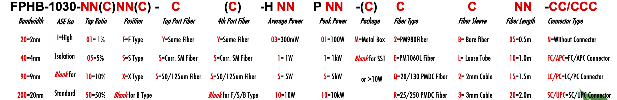 FPHB 1030nm Singlemode PM Fiber Bandpass Filter Tap coupler splitter Hybrid Bandwidth 1.3nm 2nm 2.0nm 4nm 4.0nm 6nm 6.0nm 8nm 8.0nm 10nm 10.0nm 12nm 12.0nm 13nm 13.0nm 20nm 20.0nm optical fiber bandpass filter with tap coupler or splitter hybrid device or bandstop filter Glasfaser-Bandpassfilter mit Abzweigkoppler oder Splitter-Hybridgerät oder Bandsperrfilter Filtro de paso de banda de fibra óptica con acoplador de grifo o dispositivo híbrido divisor o filtro de banda filtre passe-bande à fibre optique avec coupleur de prise ou dispositif hybride séparateur ou filtre coupe-bande optinen kuitukaistanpäästösuodatin, jossa on väliliitin tai jakajahybridilaite tai kaistanstop-suodatin filtro passa-banda de fibra óptica com acoplador de torneira ou dispositivo híbrido divisor ou filtro de parada de banda ?wiat?owodowy filtr pasmowo-przepustowy z hybrydowym urz?dzeniem sprz?gaj?cym lub rozdzielaczem lub filtrem pasmowym optisk fiber båndpassfilter med tappkopler eller splitter hybridenhet eller båndstoppfilter filtro passa banda in fibra ottica con accoppiatore di presa o dispositivo ibrido sdoppiatore o filtro elimina banda glasvezelbanddoorlaatfilter met kraankoppeling of splitter hybride apparaat of bandstopfilter pásmový filtr s optickým vláknem s odbo?ovacím vazebním ?lenem nebo rozbo?ovacím hybridním za?ízením nebo pásmovým filtrem PM980 PM980XP PM980HP LMA 6/125um 10/125um 10/130um 12/130um 15/125um 15/130um 20/125um 20/130um 25/250um 30/250um SC Single Clad Cladding DC Double Clad or large mode area fiber fibre à simple gaine ou fibre à double gaine ou fibre à grande zone de mode ingle Clad-Faser oder Double Clad-Faser oder Large-Mode-Area-Faser ibra con revestimiento simple o fibra con revestimiento doble o fibra de área modal grande fibra de revestimento simples ou fibra de revestimento duplo ou fibra de área de modo grande ibra a rivestimento singolo o fibra a doppio rivestimento o fibra a grande area modale yksikerroksinen kuitu tai kaksinkertainen kuitu tai suurimuotoinen kuitu 2-port D Type 3-port Y Type 4-port X Type Type D à 2 ports Type Y à 3 ports Type X à 4 ports -Port-D-Typ 3-Port-Y-Typ 4-Port-X-Typ Tipo D de 2 puertos Tipo Y de 3 puertos Tipo X de 4 puertos Tipo D de 2 portas Tipo Y de 3 portas Tipo X de 4 portas ipo D a 2 porte Tipo Y a 3 porte Tipo X a 4 porte 2-porttinen D-tyyppi 3-porttinen Y-tyyppi 4-porttinen X-tyyppi Polarization Maintaining PM Extinction Ratio ER Panda tie maintien de la polarisation fibre panda ou cravate avec taux d'extinction polarisationserhaltende Panda- oder Bindefaser mit Extinktionsverhältnis polarización manteniendo panda o fibra de amarre con relación de extinción polarização mantendo a fibra panda ou tie com taxa de extinção polarizzazione mantenendo panda o legare fibra con rapporto di estinzione olarisaatiota ylläpitävä panda- tai sidekuitu ekstinktiosuhteella