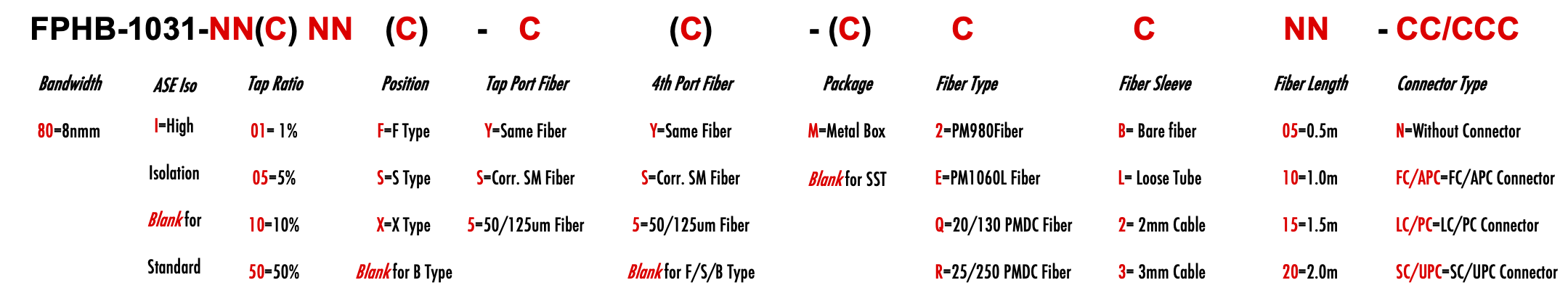 FPHB 1031nm Singlemode PM Fiber Bandpass Filter Tap coupler splitter Hybrid Bandwidth 8.0nm 8nm optical fiber bandpass filter with tap coupler or splitter hybrid device or bandstop filter Glasfaser-Bandpassfilter mit Abzweigkoppler oder Splitter-Hybridgerät oder Bandsperrfilter Filtro de paso de banda de fibra óptica con acoplador de grifo o dispositivo híbrido divisor o filtro de banda filtre passe-bande à fibre optique avec coupleur de prise ou dispositif hybride séparateur ou filtre coupe-bande optinen kuitukaistanpäästösuodatin, jossa on väliliitin tai jakajahybridilaite tai kaistanstop-suodatin filtro passa-banda de fibra óptica com acoplador de torneira ou dispositivo híbrido divisor ou filtro de parada de banda ?wiat?owodowy filtr pasmowo-przepustowy z hybrydowym urz?dzeniem sprz?gaj?cym lub rozdzielaczem lub filtrem pasmowym optisk fiber båndpassfilter med tappkopler eller splitter hybridenhet eller båndstoppfilter filtro passa banda in fibra ottica con accoppiatore di presa o dispositivo ibrido sdoppiatore o filtro elimina banda glasvezelbanddoorlaatfilter met kraankoppeling of splitter hybride apparaat of bandstopfilter pásmový filtr s optickým vláknem s odbo?ovacím vazebním ?lenem nebo rozbo?ovacím hybridním za?ízením nebo pásmovým filtrem PM980 PM980XP PM980HP LMA 6/125um 10/125um 10/130um 12/130um 15/125um 15/130um 20/125um 20/130um 25/250um 30/250um SC Single Clad Cladding DC Double Clad or large mode area fiber fibre à simple gaine ou fibre à double gaine ou fibre à grande zone de mode ingle Clad-Faser oder Double Clad-Faser oder Large-Mode-Area-Faser ibra con revestimiento simple o fibra con revestimiento doble o fibra de área modal grande fibra de revestimento simples ou fibra de revestimento duplo ou fibra de área de modo grande ibra a rivestimento singolo o fibra a doppio rivestimento o fibra a grande area modale yksikerroksinen kuitu tai kaksinkertainen kuitu tai suurimuotoinen kuitu 2-port D Type 3-port Y Type 4-port X Type Type D à 2 ports Type Y à 3 ports Type X à 4 ports -Port-D-Typ 3-Port-Y-Typ 4-Port-X-Typ Tipo D de 2 puertos Tipo Y de 3 puertos Tipo X de 4 puertos Tipo D de 2 portas Tipo Y de 3 portas Tipo X de 4 portas ipo D a 2 porte Tipo Y a 3 porte Tipo X a 4 porte 2-porttinen D-tyyppi 3-porttinen Y-tyyppi 4-porttinen X-tyyppi Polarization Maintaining PM Extinction Ratio ER Panda tie maintien de la polarisation fibre panda ou cravate avec taux d'extinction polarisationserhaltende Panda- oder Bindefaser mit Extinktionsverhältnis polarización manteniendo panda o fibra de amarre con relación de extinción polarização mantendo a fibra panda ou tie com taxa de extinção polarizzazione mantenendo panda o legare fibra con rapporto di estinzione olarisaatiota ylläpitävä panda- tai sidekuitu ekstinktiosuhteella