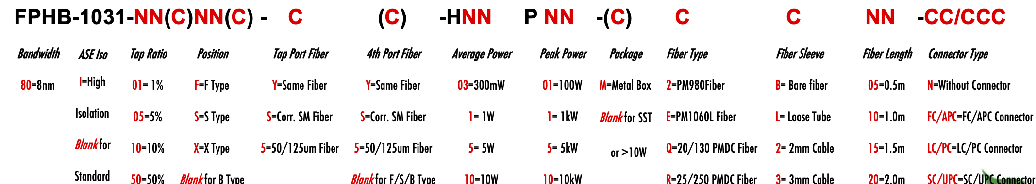FPHB 1031nm Singlemode PM Fiber Bandpass Filter Tap coupler splitter Hybrid Bandwidth 8.0nm 8nm optical fiber bandpass filter with tap coupler or splitter hybrid device or bandstop filter Glasfaser-Bandpassfilter mit Abzweigkoppler oder Splitter-Hybridgerät oder Bandsperrfilter Filtro de paso de banda de fibra óptica con acoplador de grifo o dispositivo híbrido divisor o filtro de banda filtre passe-bande à fibre optique avec coupleur de prise ou dispositif hybride séparateur ou filtre coupe-bande optinen kuitukaistanpäästösuodatin, jossa on väliliitin tai jakajahybridilaite tai kaistanstop-suodatin filtro passa-banda de fibra óptica com acoplador de torneira ou dispositivo híbrido divisor ou filtro de parada de banda ?wiat?owodowy filtr pasmowo-przepustowy z hybrydowym urz?dzeniem sprz?gaj?cym lub rozdzielaczem lub filtrem pasmowym optisk fiber båndpassfilter med tappkopler eller splitter hybridenhet eller båndstoppfilter filtro passa banda in fibra ottica con accoppiatore di presa o dispositivo ibrido sdoppiatore o filtro elimina banda glasvezelbanddoorlaatfilter met kraankoppeling of splitter hybride apparaat of bandstopfilter pásmový filtr s optickým vláknem s odbo?ovacím vazebním ?lenem nebo rozbo?ovacím hybridním za?ízením nebo pásmovým filtrem PM980 PM980XP PM980HP LMA 6/125um 10/125um 10/130um 12/130um 15/125um 15/130um 20/125um 20/130um 25/250um 30/250um SC Single Clad Cladding DC Double Clad or large mode area fiber fibre à simple gaine ou fibre à double gaine ou fibre à grande zone de mode ingle Clad-Faser oder Double Clad-Faser oder Large-Mode-Area-Faser ibra con revestimiento simple o fibra con revestimiento doble o fibra de área modal grande fibra de revestimento simples ou fibra de revestimento duplo ou fibra de área de modo grande ibra a rivestimento singolo o fibra a doppio rivestimento o fibra a grande area modale yksikerroksinen kuitu tai kaksinkertainen kuitu tai suurimuotoinen kuitu 2-port D Type 3-port Y Type 4-port X Type Type D à 2 ports Type Y à 3 ports Type X à 4 ports -Port-D-Typ 3-Port-Y-Typ 4-Port-X-Typ Tipo D de 2 puertos Tipo Y de 3 puertos Tipo X de 4 puertos Tipo D de 2 portas Tipo Y de 3 portas Tipo X de 4 portas ipo D a 2 porte Tipo Y a 3 porte Tipo X a 4 porte 2-porttinen D-tyyppi 3-porttinen Y-tyyppi 4-porttinen X-tyyppi Polarization Maintaining PM Extinction Ratio ER Panda tie maintien de la polarisation fibre panda ou cravate avec taux d'extinction polarisationserhaltende Panda- oder Bindefaser mit Extinktionsverhältnis polarización manteniendo panda o fibra de amarre con relación de extinción polarização mantendo a fibra panda ou tie com taxa de extinção polarizzazione mantenendo panda o legare fibra con rapporto di estinzione olarisaatiota ylläpitävä panda- tai sidekuitu ekstinktiosuhteella