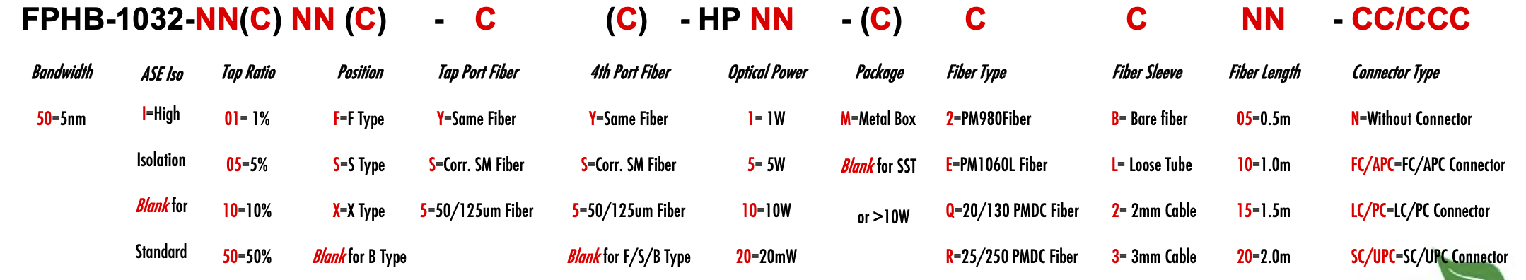 FPHB 1032nm Singlemode PM Fiber Bandpass Filter Tap coupler splitter Hybrid Bandwidth 5.0nm 5nm optical fiber bandpass filter with tap coupler or splitter hybrid device or bandstop filter Glasfaser-Bandpassfilter mit Abzweigkoppler oder Splitter-Hybridgerät oder Bandsperrfilter Filtro de paso de banda de fibra óptica con acoplador de grifo o dispositivo híbrido divisor o filtro de banda filtre passe-bande à fibre optique avec coupleur de prise ou dispositif hybride séparateur ou filtre coupe-bande optinen kuitukaistanpäästösuodatin, jossa on väliliitin tai jakajahybridilaite tai kaistanstop-suodatin filtro passa-banda de fibra óptica com acoplador de torneira ou dispositivo híbrido divisor ou filtro de parada de banda ?wiat?owodowy filtr pasmowo-przepustowy z hybrydowym urz?dzeniem sprz?gaj?cym lub rozdzielaczem lub filtrem pasmowym optisk fiber båndpassfilter med tappkopler eller splitter hybridenhet eller båndstoppfilter filtro passa banda in fibra ottica con accoppiatore di presa o dispositivo ibrido sdoppiatore o filtro elimina banda glasvezelbanddoorlaatfilter met kraankoppeling of splitter hybride apparaat of bandstopfilter pásmový filtr s optickým vláknem s odbo?ovacím vazebním ?lenem nebo rozbo?ovacím hybridním za?ízením nebo pásmovým filtrem PM980 PM980XP PM980HP LMA 6/125um 10/125um 10/130um 12/130um 15/125um 15/130um 20/125um 20/130um 25/250um 30/250um SC Single Clad Cladding DC Double Clad or large mode area fiber fibre à simple gaine ou fibre à double gaine ou fibre à grande zone de mode ingle Clad-Faser oder Double Clad-Faser oder Large-Mode-Area-Faser ibra con revestimiento simple o fibra con revestimiento doble o fibra de área modal grande fibra de revestimento simples ou fibra de revestimento duplo ou fibra de área de modo grande ibra a rivestimento singolo o fibra a doppio rivestimento o fibra a grande area modale yksikerroksinen kuitu tai kaksinkertainen kuitu tai suurimuotoinen kuitu 2-port D Type 3-port Y Type 4-port X Type Type D à 2 ports Type Y à 3 ports Type X à 4 ports -Port-D-Typ 3-Port-Y-Typ 4-Port-X-Typ Tipo D de 2 puertos Tipo Y de 3 puertos Tipo X de 4 puertos Tipo D de 2 portas Tipo Y de 3 portas Tipo X de 4 portas ipo D a 2 porte Tipo Y a 3 porte Tipo X a 4 porte 2-porttinen D-tyyppi 3-porttinen Y-tyyppi 4-porttinen X-tyyppi Polarization Maintaining PM Extinction Ratio ER Panda tie maintien de la polarisation fibre panda ou cravate avec taux d'extinction polarisationserhaltende Panda- oder Bindefaser mit Extinktionsverhältnis polarización manteniendo panda o fibra de amarre con relación de extinción polarização mantendo a fibra panda ou tie com taxa de extinção polarizzazione mantenendo panda o legare fibra con rapporto di estinzione olarisaatiota ylläpitävä panda- tai sidekuitu ekstinktiosuhteella