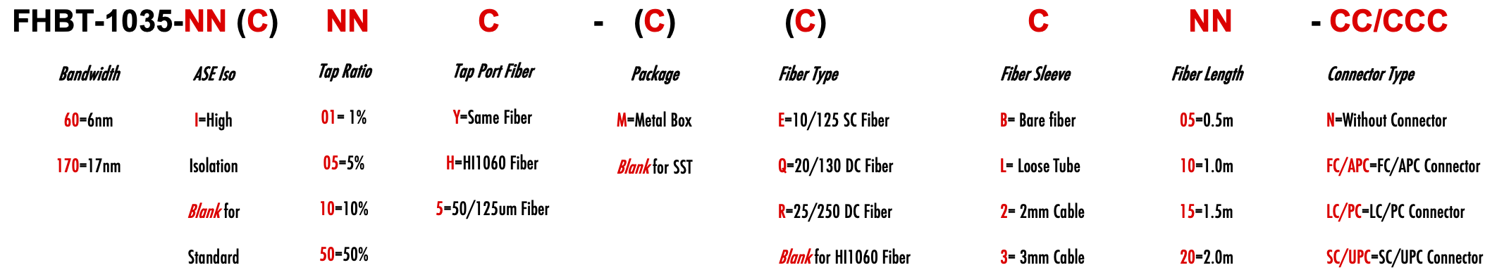 FHBT 1035nm Singlemode SM Fiber Bandpass Filter Tap coupler splitter Hybrid Bandwidth 6.0nm 17.0nm 6nm 17nm optical fiber bandpass filter with tap coupler or splitter hybrid device or bandstop filter Glasfaser-Bandpassfilter mit Abzweigkoppler oder Splitter-Hybridgerät oder Bandsperrfilter Filtro de paso de banda de fibra óptica con acoplador de grifo o dispositivo híbrido divisor o filtro de banda filtre passe-bande à fibre optique avec coupleur de prise ou dispositif hybride séparateur ou filtre coupe-bande optinen kuitukaistanpäästösuodatin, jossa on väliliitin tai jakajahybridilaite tai kaistanstop-suodatin filtro passa-banda de fibra óptica com acoplador de torneira ou dispositivo híbrido divisor ou filtro de parada de banda ?wiat?owodowy filtr pasmowo-przepustowy z hybrydowym urz?dzeniem sprz?gaj?cym lub rozdzielaczem lub filtrem pasmowym optisk fiber båndpassfilter med tappkopler eller splitter hybridenhet eller båndstoppfilter filtro passa banda in fibra ottica con accoppiatore di presa o dispositivo ibrido sdoppiatore o filtro elimina banda glasvezelbanddoorlaatfilter met kraankoppeling of splitter hybride apparaat of bandstopfilter pásmový filtr s optickým vláknem s odbo?ovacím vazebním ?lenem nebo rozbo?ovacím hybridním za?ízením nebo pásmovým filtrem HI1060 1060XP LMA 6/125um 10/125um 10/130um 12/125um 12/130um 15/125um 15/130um 20/125um 20/130um 25/250um 30/250um SC Single Clad Cladding DC Double Clad or large mode area fiber fibre à simple gaine ou fibre à double gaine ou fibre à grande zone de mode ingle Clad-Faser oder Double Clad-Faser oder Large-Mode-Area-Faser ibra con revestimiento simple o fibra con revestimiento doble o fibra de área modal grande fibra de revestimento simples ou fibra de revestimento duplo ou fibra de área de modo grande ibra a rivestimento singolo o fibra a doppio rivestimento o fibra a grande area modale yksikerroksinen kuitu tai kaksinkertainen kuitu tai suurimuotoinen kuitu 2-port D Type 3-port Y Type 4-port X Type Type D à 2 ports Type Y à 3 ports Type X à 4 ports -Port-D-Typ 3-Port-Y-Typ 4-Port-X-Typ Tipo D de 2 puertos Tipo Y de 3 puertos Tipo X de 4 puertos Tipo D de 2 portas Tipo Y de 3 portas Tipo X de 4 portas ipo D a 2 porte Tipo Y a 3 porte Tipo X a 4 porte 2-porttinen D-tyyppi 3-porttinen Y-tyyppi 4-porttinen X-tyyppi