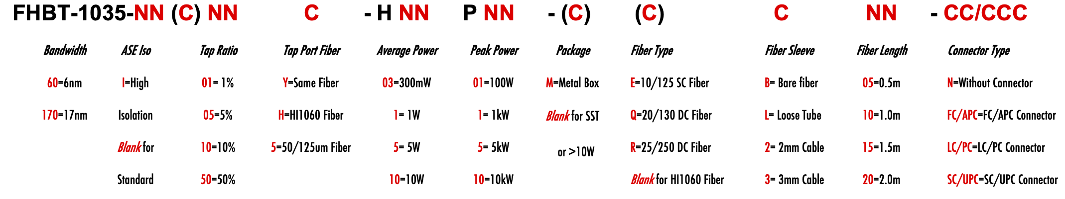 FHBT 1035nm Singlemode SM Fiber Bandpass Filter Tap coupler splitter Hybrid Bandwidth 6.0nm 17.0nm 6nm 17nm optical fiber bandpass filter with tap coupler or splitter hybrid device or bandstop filter Glasfaser-Bandpassfilter mit Abzweigkoppler oder Splitter-Hybridgerät oder Bandsperrfilter Filtro de paso de banda de fibra óptica con acoplador de grifo o dispositivo híbrido divisor o filtro de banda filtre passe-bande à fibre optique avec coupleur de prise ou dispositif hybride séparateur ou filtre coupe-bande optinen kuitukaistanpäästösuodatin, jossa on väliliitin tai jakajahybridilaite tai kaistanstop-suodatin filtro passa-banda de fibra óptica com acoplador de torneira ou dispositivo híbrido divisor ou filtro de parada de banda ?wiat?owodowy filtr pasmowo-przepustowy z hybrydowym urz?dzeniem sprz?gaj?cym lub rozdzielaczem lub filtrem pasmowym optisk fiber båndpassfilter med tappkopler eller splitter hybridenhet eller båndstoppfilter filtro passa banda in fibra ottica con accoppiatore di presa o dispositivo ibrido sdoppiatore o filtro elimina banda glasvezelbanddoorlaatfilter met kraankoppeling of splitter hybride apparaat of bandstopfilter pásmový filtr s optickým vláknem s odbo?ovacím vazebním ?lenem nebo rozbo?ovacím hybridním za?ízením nebo pásmovým filtrem HI1060 1060XP LMA 6/125um 10/125um 10/130um 12/125um 12/130um 15/125um 15/130um 20/125um 20/130um 25/250um 30/250um SC Single Clad Cladding DC Double Clad or large mode area fiber fibre à simple gaine ou fibre à double gaine ou fibre à grande zone de mode ingle Clad-Faser oder Double Clad-Faser oder Large-Mode-Area-Faser ibra con revestimiento simple o fibra con revestimiento doble o fibra de área modal grande fibra de revestimento simples ou fibra de revestimento duplo ou fibra de área de modo grande ibra a rivestimento singolo o fibra a doppio rivestimento o fibra a grande area modale yksikerroksinen kuitu tai kaksinkertainen kuitu tai suurimuotoinen kuitu 2-port D Type 3-port Y Type 4-port X Type Type D à 2 ports Type Y à 3 ports Type X à 4 ports -Port-D-Typ 3-Port-Y-Typ 4-Port-X-Typ Tipo D de 2 puertos Tipo Y de 3 puertos Tipo X de 4 puertos Tipo D de 2 portas Tipo Y de 3 portas Tipo X de 4 portas ipo D a 2 porte Tipo Y a 3 porte Tipo X a 4 porte 2-porttinen D-tyyppi 3-porttinen Y-tyyppi 4-porttinen X-tyyppi