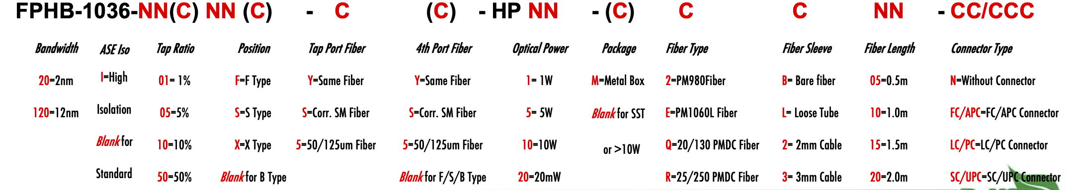 FPHB 1036nm Singlemode PM Fiber Bandpass Filter Tap coupler splitter Hybrid Bandwidth 2.0nm 12.0 2nm 12nm optical fiber bandpass filter with tap coupler or splitter hybrid device or bandstop filter Glasfaser-Bandpassfilter mit Abzweigkoppler oder Splitter-Hybridgerät oder Bandsperrfilter Filtro de paso de banda de fibra óptica con acoplador de grifo o dispositivo híbrido divisor o filtro de banda filtre passe-bande à fibre optique avec coupleur de prise ou dispositif hybride séparateur ou filtre coupe-bande optinen kuitukaistanpäästösuodatin, jossa on väliliitin tai jakajahybridilaite tai kaistanstop-suodatin filtro passa-banda de fibra óptica com acoplador de torneira ou dispositivo híbrido divisor ou filtro de parada de banda ?wiat?owodowy filtr pasmowo-przepustowy z hybrydowym urz?dzeniem sprz?gaj?cym lub rozdzielaczem lub filtrem pasmowym optisk fiber båndpassfilter med tappkopler eller splitter hybridenhet eller båndstoppfilter filtro passa banda in fibra ottica con accoppiatore di presa o dispositivo ibrido sdoppiatore o filtro elimina banda glasvezelbanddoorlaatfilter met kraankoppeling of splitter hybride apparaat of bandstopfilter pásmový filtr s optickým vláknem s odbo?ovacím vazebním ?lenem nebo rozbo?ovacím hybridním za?ízením nebo pásmovým filtrem PM980 PM980XP PM980HP LMA 6/125um 10/125um 10/130um 12/130um 15/125um 15/130um 20/125um 20/130um 25/250um 30/250um SC Single Clad Cladding DC Double Clad or large mode area fiber fibre à simple gaine ou fibre à double gaine ou fibre à grande zone de mode ingle Clad-Faser oder Double Clad-Faser oder Large-Mode-Area-Faser ibra con revestimiento simple o fibra con revestimiento doble o fibra de área modal grande fibra de revestimento simples ou fibra de revestimento duplo ou fibra de área de modo grande ibra a rivestimento singolo o fibra a doppio rivestimento o fibra a grande area modale yksikerroksinen kuitu tai kaksinkertainen kuitu tai suurimuotoinen kuitu 2-port D Type 3-port Y Type 4-port X Type Type D à 2 ports Type Y à 3 ports Type X à 4 ports -Port-D-Typ 3-Port-Y-Typ 4-Port-X-Typ Tipo D de 2 puertos Tipo Y de 3 puertos Tipo X de 4 puertos Tipo D de 2 portas Tipo Y de 3 portas Tipo X de 4 portas ipo D a 2 porte Tipo Y a 3 porte Tipo X a 4 porte 2-porttinen D-tyyppi 3-porttinen Y-tyyppi 4-porttinen X-tyyppi Polarization Maintaining PM Extinction Ratio ER Panda tie maintien de la polarisation fibre panda ou cravate avec taux d'extinction polarisationserhaltende Panda- oder Bindefaser mit Extinktionsverhältnis polarización manteniendo panda o fibra de amarre con relación de extinción polarização mantendo a fibra panda ou tie com taxa de extinção polarizzazione mantenendo panda o legare fibra con rapporto di estinzione olarisaatiota ylläpitävä panda- tai sidekuitu ekstinktiosuhteella