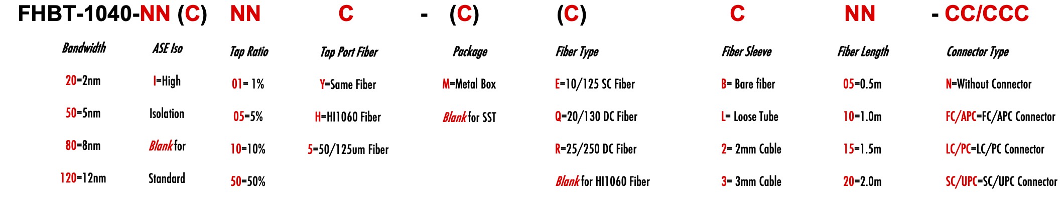 FHBT 1040nm Singlemode SM Fiber Bandpass Filter Tap coupler splitter Hybrid Bandwidth 2.0nm 5.0nm 8.0nm 12.0nm 2nm 5nm 8nm 12nm optical fiber bandpass filter with tap coupler or splitter hybrid device or bandstop filter Glasfaser-Bandpassfilter mit Abzweigkoppler oder Splitter-Hybridgerät oder Bandsperrfilter Filtro de paso de banda de fibra óptica con acoplador de grifo o dispositivo híbrido divisor o filtro de banda filtre passe-bande à fibre optique avec coupleur de prise ou dispositif hybride séparateur ou filtre coupe-bande optinen kuitukaistanpäästösuodatin, jossa on väliliitin tai jakajahybridilaite tai kaistanstop-suodatin filtro passa-banda de fibra óptica com acoplador de torneira ou dispositivo híbrido divisor ou filtro de parada de banda ?wiat?owodowy filtr pasmowo-przepustowy z hybrydowym urz?dzeniem sprz?gaj?cym lub rozdzielaczem lub filtrem pasmowym optisk fiber båndpassfilter med tappkopler eller splitter hybridenhet eller båndstoppfilter filtro passa banda in fibra ottica con accoppiatore di presa o dispositivo ibrido sdoppiatore o filtro elimina banda glasvezelbanddoorlaatfilter met kraankoppeling of splitter hybride apparaat of bandstopfilter pásmový filtr s optickým vláknem s odbo?ovacím vazebním ?lenem nebo rozbo?ovacím hybridním za?ízením nebo pásmovým filtrem HI1060 1060XP LMA 6/125um 10/125um 10/130um 12/125um 12/130um 15/125um 15/130um 20/125um 20/130um 25/250um 30/250um SC Single Clad Cladding DC Double Clad or large mode area fiber fibre à simple gaine ou fibre à double gaine ou fibre à grande zone de mode ingle Clad-Faser oder Double Clad-Faser oder Large-Mode-Area-Faser ibra con revestimiento simple o fibra con revestimiento doble o fibra de área modal grande fibra de revestimento simples ou fibra de revestimento duplo ou fibra de área de modo grande ibra a rivestimento singolo o fibra a doppio rivestimento o fibra a grande area modale yksikerroksinen kuitu tai kaksinkertainen kuitu tai suurimuotoinen kuitu 2-port D Type 3-port Y Type 4-port X Type Type D à 2 ports Type Y à 3 ports Type X à 4 ports -Port-D-Typ 3-Port-Y-Typ 4-Port-X-Typ Tipo D de 2 puertos Tipo Y de 3 puertos Tipo X de 4 puertos Tipo D de 2 portas Tipo Y de 3 portas Tipo X de 4 portas ipo D a 2 porte Tipo Y a 3 porte Tipo X a 4 porte 2-porttinen D-tyyppi 3-porttinen Y-tyyppi 4-porttinen X-tyyppi
