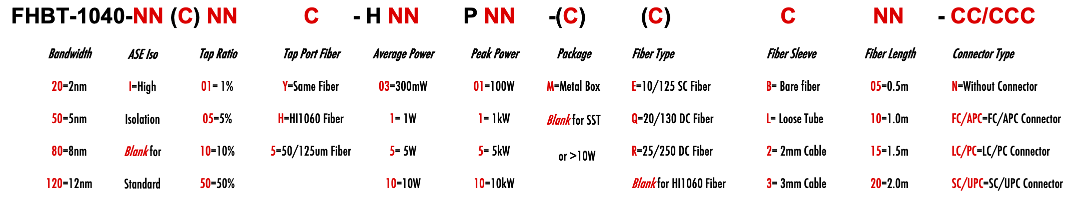 FHBT 1040nm Singlemode SM Fiber Bandpass Filter Tap coupler splitter Hybrid Bandwidth 2.0nm 5.0nm 8.0nm 12.0nm 2nm 5nm 8nm 12nm optical fiber bandpass filter with tap coupler or splitter hybrid device or bandstop filter Glasfaser-Bandpassfilter mit Abzweigkoppler oder Splitter-Hybridgerät oder Bandsperrfilter Filtro de paso de banda de fibra óptica con acoplador de grifo o dispositivo híbrido divisor o filtro de banda filtre passe-bande à fibre optique avec coupleur de prise ou dispositif hybride séparateur ou filtre coupe-bande optinen kuitukaistanpäästösuodatin, jossa on väliliitin tai jakajahybridilaite tai kaistanstop-suodatin filtro passa-banda de fibra óptica com acoplador de torneira ou dispositivo híbrido divisor ou filtro de parada de banda ?wiat?owodowy filtr pasmowo-przepustowy z hybrydowym urz?dzeniem sprz?gaj?cym lub rozdzielaczem lub filtrem pasmowym optisk fiber båndpassfilter med tappkopler eller splitter hybridenhet eller båndstoppfilter filtro passa banda in fibra ottica con accoppiatore di presa o dispositivo ibrido sdoppiatore o filtro elimina banda glasvezelbanddoorlaatfilter met kraankoppeling of splitter hybride apparaat of bandstopfilter pásmový filtr s optickým vláknem s odbo?ovacím vazebním ?lenem nebo rozbo?ovacím hybridním za?ízením nebo pásmovým filtrem HI1060 1060XP LMA 6/125um 10/125um 10/130um 12/125um 12/130um 15/125um 15/130um 20/125um 20/130um 25/250um 30/250um SC Single Clad Cladding DC Double Clad or large mode area fiber fibre à simple gaine ou fibre à double gaine ou fibre à grande zone de mode ingle Clad-Faser oder Double Clad-Faser oder Large-Mode-Area-Faser ibra con revestimiento simple o fibra con revestimiento doble o fibra de área modal grande fibra de revestimento simples ou fibra de revestimento duplo ou fibra de área de modo grande ibra a rivestimento singolo o fibra a doppio rivestimento o fibra a grande area modale yksikerroksinen kuitu tai kaksinkertainen kuitu tai suurimuotoinen kuitu 2-port D Type 3-port Y Type 4-port X Type Type D à 2 ports Type Y à 3 ports Type X à 4 ports -Port-D-Typ 3-Port-Y-Typ 4-Port-X-Typ Tipo D de 2 puertos Tipo Y de 3 puertos Tipo X de 4 puertos Tipo D de 2 portas Tipo Y de 3 portas Tipo X de 4 portas ipo D a 2 porte Tipo Y a 3 porte Tipo X a 4 porte 2-porttinen D-tyyppi 3-porttinen Y-tyyppi 4-porttinen X-tyyppi