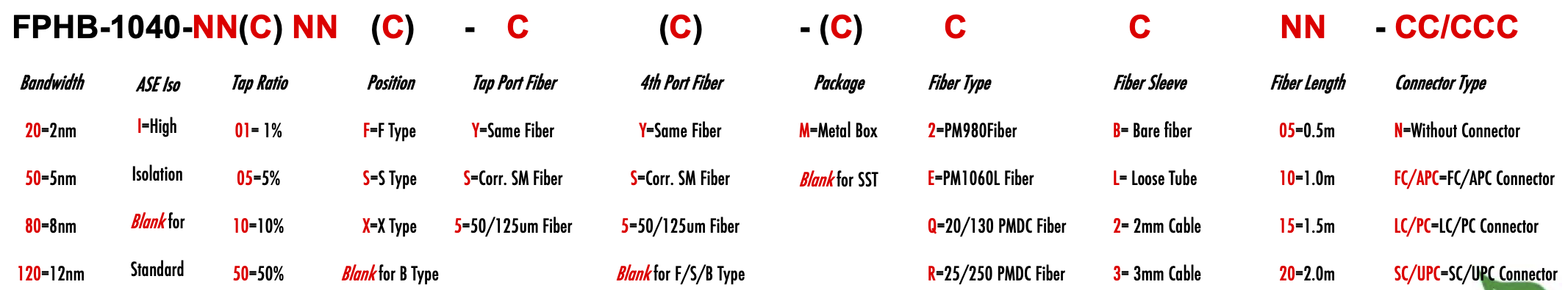 FPHB 1040nm Singlemode PM Fiber Bandpass Filter Tap coupler splitter Hybrid Bandwidth 2.0nm 5.0nm 8.0nm 12.0nm 2nm 5nm 8nm 12nm optical fiber bandpass filter with tap coupler or splitter hybrid device or bandstop filter Glasfaser-Bandpassfilter mit Abzweigkoppler oder Splitter-Hybridgerät oder Bandsperrfilter Filtro de paso de banda de fibra óptica con acoplador de grifo o dispositivo híbrido divisor o filtro de banda filtre passe-bande à fibre optique avec coupleur de prise ou dispositif hybride séparateur ou filtre coupe-bande optinen kuitukaistanpäästösuodatin, jossa on väliliitin tai jakajahybridilaite tai kaistanstop-suodatin filtro passa-banda de fibra óptica com acoplador de torneira ou dispositivo híbrido divisor ou filtro de parada de banda ?wiat?owodowy filtr pasmowo-przepustowy z hybrydowym urz?dzeniem sprz?gaj?cym lub rozdzielaczem lub filtrem pasmowym optisk fiber båndpassfilter med tappkopler eller splitter hybridenhet eller båndstoppfilter filtro passa banda in fibra ottica con accoppiatore di presa o dispositivo ibrido sdoppiatore o filtro elimina banda glasvezelbanddoorlaatfilter met kraankoppeling of splitter hybride apparaat of bandstopfilter pásmový filtr s optickým vláknem s odbo?ovacím vazebním ?lenem nebo rozbo?ovacím hybridním za?ízením nebo pásmovým filtrem PM980 PM980XP PM980HP LMA 6/125um 10/125um 10/130um 12/130um 15/125um 15/130um 20/125um 20/130um 25/250um 30/250um SC Single Clad Cladding DC Double Clad or large mode area fiber fibre à simple gaine ou fibre à double gaine ou fibre à grande zone de mode ingle Clad-Faser oder Double Clad-Faser oder Large-Mode-Area-Faser ibra con revestimiento simple o fibra con revestimiento doble o fibra de área modal grande fibra de revestimento simples ou fibra de revestimento duplo ou fibra de área de modo grande ibra a rivestimento singolo o fibra a doppio rivestimento o fibra a grande area modale yksikerroksinen kuitu tai kaksinkertainen kuitu tai suurimuotoinen kuitu 2-port D Type 3-port Y Type 4-port X Type Type D à 2 ports Type Y à 3 ports Type X à 4 ports -Port-D-Typ 3-Port-Y-Typ 4-Port-X-Typ Tipo D de 2 puertos Tipo Y de 3 puertos Tipo X de 4 puertos Tipo D de 2 portas Tipo Y de 3 portas Tipo X de 4 portas ipo D a 2 porte Tipo Y a 3 porte Tipo X a 4 porte 2-porttinen D-tyyppi 3-porttinen Y-tyyppi 4-porttinen X-tyyppi Polarization Maintaining PM Extinction Ratio ER Panda tie maintien de la polarisation fibre panda ou cravate avec taux d'extinction polarisationserhaltende Panda- oder Bindefaser mit Extinktionsverhältnis polarización manteniendo panda o fibra de amarre con relación de extinción polarização mantendo a fibra panda ou tie com taxa de extinção polarizzazione mantenendo panda o legare fibra con rapporto di estinzione olarisaatiota ylläpitävä panda- tai sidekuitu ekstinktiosuhteella