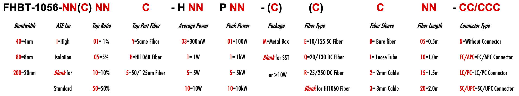 FHBT 1056nm Singlemode SM Fiber Bandpass Filter Tap coupler splitter Hybrid Bandwidth 4.0nm 8.0nm 20.0nm 4nm 8nm 20nm optical fiber bandpass filter with tap coupler or splitter hybrid device or bandstop filter Glasfaser-Bandpassfilter mit Abzweigkoppler oder Splitter-Hybridgerät oder Bandsperrfilter Filtro de paso de banda de fibra óptica con acoplador de grifo o dispositivo híbrido divisor o filtro de banda filtre passe-bande à fibre optique avec coupleur de prise ou dispositif hybride séparateur ou filtre coupe-bande optinen kuitukaistanpäästösuodatin, jossa on väliliitin tai jakajahybridilaite tai kaistanstop-suodatin filtro passa-banda de fibra óptica com acoplador de torneira ou dispositivo híbrido divisor ou filtro de parada de banda ?wiat?owodowy filtr pasmowo-przepustowy z hybrydowym urz?dzeniem sprz?gaj?cym lub rozdzielaczem lub filtrem pasmowym optisk fiber båndpassfilter med tappkopler eller splitter hybridenhet eller båndstoppfilter filtro passa banda in fibra ottica con accoppiatore di presa o dispositivo ibrido sdoppiatore o filtro elimina banda glasvezelbanddoorlaatfilter met kraankoppeling of splitter hybride apparaat of bandstopfilter pásmový filtr s optickým vláknem s odbo?ovacím vazebním ?lenem nebo rozbo?ovacím hybridním za?ízením nebo pásmovým filtrem HI1060 1060XP LMA 6/125um 10/125um 10/130um 12/125um 12/130um 15/125um 15/130um 20/125um 20/130um 25/250um 30/250um SC Single Clad Cladding DC Double Clad or large mode area fiber fibre à simple gaine ou fibre à double gaine ou fibre à grande zone de mode ingle Clad-Faser oder Double Clad-Faser oder Large-Mode-Area-Faser ibra con revestimiento simple o fibra con revestimiento doble o fibra de área modal grande fibra de revestimento simples ou fibra de revestimento duplo ou fibra de área de modo grande ibra a rivestimento singolo o fibra a doppio rivestimento o fibra a grande area modale yksikerroksinen kuitu tai kaksinkertainen kuitu tai suurimuotoinen kuitu 2-port D Type 3-port Y Type 4-port X Type Type D à 2 ports Type Y à 3 ports Type X à 4 ports -Port-D-Typ 3-Port-Y-Typ 4-Port-X-Typ Tipo D de 2 puertos Tipo Y de 3 puertos Tipo X de 4 puertos Tipo D de 2 portas Tipo Y de 3 portas Tipo X de 4 portas ipo D a 2 porte Tipo Y a 3 porte Tipo X a 4 porte 2-porttinen D-tyyppi 3-porttinen Y-tyyppi 4-porttinen X-tyyppi