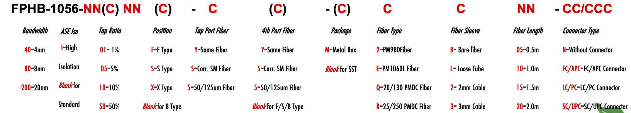 FPHB 1056nm Singlemode PM Fiber Bandpass Filter Tap coupler splitter Hybrid Bandwidth 4.0nm 8.0nm 20.0nm 4nm 8nm 20nm optical fiber bandpass filter with tap coupler or splitter hybrid device or bandstop filter Glasfaser-Bandpassfilter mit Abzweigkoppler oder Splitter-Hybridgerät oder Bandsperrfilter Filtro de paso de banda de fibra óptica con acoplador de grifo o dispositivo híbrido divisor o filtro de banda filtre passe-bande à fibre optique avec coupleur de prise ou dispositif hybride séparateur ou filtre coupe-bande optinen kuitukaistanpäästösuodatin, jossa on väliliitin tai jakajahybridilaite tai kaistanstop-suodatin filtro passa-banda de fibra óptica com acoplador de torneira ou dispositivo híbrido divisor ou filtro de parada de banda ?wiat?owodowy filtr pasmowo-przepustowy z hybrydowym urz?dzeniem sprz?gaj?cym lub rozdzielaczem lub filtrem pasmowym optisk fiber båndpassfilter med tappkopler eller splitter hybridenhet eller båndstoppfilter filtro passa banda in fibra ottica con accoppiatore di presa o dispositivo ibrido sdoppiatore o filtro elimina banda glasvezelbanddoorlaatfilter met kraankoppeling of splitter hybride apparaat of bandstopfilter pásmový filtr s optickým vláknem s odbo?ovacím vazebním ?lenem nebo rozbo?ovacím hybridním za?ízením nebo pásmovým filtrem PM980 PM980XP PM980HP LMA 6/125um 10/125um 10/130um 12/130um 15/125um 15/130um 20/125um 20/130um 25/250um 30/250um SC Single Clad Cladding DC Double Clad or large mode area fiber fibre à simple gaine ou fibre à double gaine ou fibre à grande zone de mode ingle Clad-Faser oder Double Clad-Faser oder Large-Mode-Area-Faser ibra con revestimiento simple o fibra con revestimiento doble o fibra de área modal grande fibra de revestimento simples ou fibra de revestimento duplo ou fibra de área de modo grande ibra a rivestimento singolo o fibra a doppio rivestimento o fibra a grande area modale yksikerroksinen kuitu tai kaksinkertainen kuitu tai suurimuotoinen kuitu 2-port D Type 3-port Y Type 4-port X Type Type D à 2 ports Type Y à 3 ports Type X à 4 ports -Port-D-Typ 3-Port-Y-Typ 4-Port-X-Typ Tipo D de 2 puertos Tipo Y de 3 puertos Tipo X de 4 puertos Tipo D de 2 portas Tipo Y de 3 portas Tipo X de 4 portas ipo D a 2 porte Tipo Y a 3 porte Tipo X a 4 porte 2-porttinen D-tyyppi 3-porttinen Y-tyyppi 4-porttinen X-tyyppi Polarization Maintaining PM Extinction Ratio ER Panda tie maintien de la polarisation fibre panda ou cravate avec taux d'extinction polarisationserhaltende Panda- oder Bindefaser mit Extinktionsverhältnis polarización manteniendo panda o fibra de amarre con relación de extinción polarização mantendo a fibra panda ou tie com taxa de extinção polarizzazione mantenendo panda o legare fibra con rapporto di estinzione olarisaatiota ylläpitävä panda- tai sidekuitu ekstinktiosuhteella