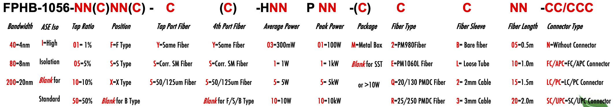 FPHB 1056nm Singlemode PM Fiber Bandpass Filter Tap coupler splitter Hybrid Bandwidth 4.0nm 8.0nm 20.0nm 4nm 8nm 20nm optical fiber bandpass filter with tap coupler or splitter hybrid device or bandstop filter Glasfaser-Bandpassfilter mit Abzweigkoppler oder Splitter-Hybridgerät oder Bandsperrfilter Filtro de paso de banda de fibra óptica con acoplador de grifo o dispositivo híbrido divisor o filtro de banda filtre passe-bande à fibre optique avec coupleur de prise ou dispositif hybride séparateur ou filtre coupe-bande optinen kuitukaistanpäästösuodatin, jossa on väliliitin tai jakajahybridilaite tai kaistanstop-suodatin filtro passa-banda de fibra óptica com acoplador de torneira ou dispositivo híbrido divisor ou filtro de parada de banda ?wiat?owodowy filtr pasmowo-przepustowy z hybrydowym urz?dzeniem sprz?gaj?cym lub rozdzielaczem lub filtrem pasmowym optisk fiber båndpassfilter med tappkopler eller splitter hybridenhet eller båndstoppfilter filtro passa banda in fibra ottica con accoppiatore di presa o dispositivo ibrido sdoppiatore o filtro elimina banda glasvezelbanddoorlaatfilter met kraankoppeling of splitter hybride apparaat of bandstopfilter pásmový filtr s optickým vláknem s odbo?ovacím vazebním ?lenem nebo rozbo?ovacím hybridním za?ízením nebo pásmovým filtrem PM980 PM980XP PM980HP LMA 6/125um 10/125um 10/130um 12/130um 15/125um 15/130um 20/125um 20/130um 25/250um 30/250um SC Single Clad Cladding DC Double Clad or large mode area fiber fibre à simple gaine ou fibre à double gaine ou fibre à grande zone de mode ingle Clad-Faser oder Double Clad-Faser oder Large-Mode-Area-Faser ibra con revestimiento simple o fibra con revestimiento doble o fibra de área modal grande fibra de revestimento simples ou fibra de revestimento duplo ou fibra de área de modo grande ibra a rivestimento singolo o fibra a doppio rivestimento o fibra a grande area modale yksikerroksinen kuitu tai kaksinkertainen kuitu tai suurimuotoinen kuitu 2-port D Type 3-port Y Type 4-port X Type Type D à 2 ports Type Y à 3 ports Type X à 4 ports -Port-D-Typ 3-Port-Y-Typ 4-Port-X-Typ Tipo D de 2 puertos Tipo Y de 3 puertos Tipo X de 4 puertos Tipo D de 2 portas Tipo Y de 3 portas Tipo X de 4 portas ipo D a 2 porte Tipo Y a 3 porte Tipo X a 4 porte 2-porttinen D-tyyppi 3-porttinen Y-tyyppi 4-porttinen X-tyyppi Polarization Maintaining PM Extinction Ratio ER Panda tie maintien de la polarisation fibre panda ou cravate avec taux d'extinction polarisationserhaltende Panda- oder Bindefaser mit Extinktionsverhältnis polarización manteniendo panda o fibra de amarre con relación de extinción polarização mantendo a fibra panda ou tie com taxa de extinção polarizzazione mantenendo panda o legare fibra con rapporto di estinzione olarisaatiota ylläpitävä panda- tai sidekuitu ekstinktiosuhteella