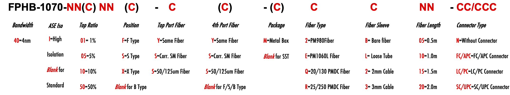 FPHB 1070nm Singlemode PM Fiber Bandpass Filter Tap coupler splitter Hybrid Bandwidth 4.0nm 4nm optical fiber bandpass filter with tap coupler or splitter hybrid device or bandstop filter Glasfaser-Bandpassfilter mit Abzweigkoppler oder Splitter-Hybridgerät oder Bandsperrfilter Filtro de paso de banda de fibra óptica con acoplador de grifo o dispositivo híbrido divisor o filtro de banda filtre passe-bande à fibre optique avec coupleur de prise ou dispositif hybride séparateur ou filtre coupe-bande optinen kuitukaistanpäästösuodatin, jossa on väliliitin tai jakajahybridilaite tai kaistanstop-suodatin filtro passa-banda de fibra óptica com acoplador de torneira ou dispositivo híbrido divisor ou filtro de parada de banda ?wiat?owodowy filtr pasmowo-przepustowy z hybrydowym urz?dzeniem sprz?gaj?cym lub rozdzielaczem lub filtrem pasmowym optisk fiber båndpassfilter med tappkopler eller splitter hybridenhet eller båndstoppfilter filtro passa banda in fibra ottica con accoppiatore di presa o dispositivo ibrido sdoppiatore o filtro elimina banda glasvezelbanddoorlaatfilter met kraankoppeling of splitter hybride apparaat of bandstopfilter pásmový filtr s optickým vláknem s odbo?ovacím vazebním ?lenem nebo rozbo?ovacím hybridním za?ízením nebo pásmovým filtrem PM980 PM980XP PM980HP LMA 6/125um 10/125um 10/130um 12/130um 15/125um 15/130um 20/125um 20/130um 25/250um 30/250um SC Single Clad Cladding DC Double Clad or large mode area fiber fibre à simple gaine ou fibre à double gaine ou fibre à grande zone de mode ingle Clad-Faser oder Double Clad-Faser oder Large-Mode-Area-Faser ibra con revestimiento simple o fibra con revestimiento doble o fibra de área modal grande fibra de revestimento simples ou fibra de revestimento duplo ou fibra de área de modo grande ibra a rivestimento singolo o fibra a doppio rivestimento o fibra a grande area modale yksikerroksinen kuitu tai kaksinkertainen kuitu tai suurimuotoinen kuitu 2-port D Type 3-port Y Type 4-port X Type Type D à 2 ports Type Y à 3 ports Type X à 4 ports -Port-D-Typ 3-Port-Y-Typ 4-Port-X-Typ Tipo D de 2 puertos Tipo Y de 3 puertos Tipo X de 4 puertos Tipo D de 2 portas Tipo Y de 3 portas Tipo X de 4 portas ipo D a 2 porte Tipo Y a 3 porte Tipo X a 4 porte 2-porttinen D-tyyppi 3-porttinen Y-tyyppi 4-porttinen X-tyyppi Polarization Maintaining PM Extinction Ratio ER Panda tie maintien de la polarisation fibre panda ou cravate avec taux d'extinction polarisationserhaltende Panda- oder Bindefaser mit Extinktionsverhältnis polarización manteniendo panda o fibra de amarre con relación de extinción polarização mantendo a fibra panda ou tie com taxa de extinção polarizzazione mantenendo panda o legare fibra con rapporto di estinzione olarisaatiota ylläpitävä panda- tai sidekuitu ekstinktiosuhteella