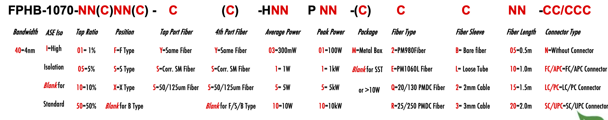 FPHB 1070nm Singlemode PM Fiber Bandpass Filter Tap coupler splitter Hybrid Bandwidth 4.0nm 4nm optical fiber bandpass filter with tap coupler or splitter hybrid device or bandstop filter Glasfaser-Bandpassfilter mit Abzweigkoppler oder Splitter-Hybridgerät oder Bandsperrfilter Filtro de paso de banda de fibra óptica con acoplador de grifo o dispositivo híbrido divisor o filtro de banda filtre passe-bande à fibre optique avec coupleur de prise ou dispositif hybride séparateur ou filtre coupe-bande optinen kuitukaistanpäästösuodatin, jossa on väliliitin tai jakajahybridilaite tai kaistanstop-suodatin filtro passa-banda de fibra óptica com acoplador de torneira ou dispositivo híbrido divisor ou filtro de parada de banda ?wiat?owodowy filtr pasmowo-przepustowy z hybrydowym urz?dzeniem sprz?gaj?cym lub rozdzielaczem lub filtrem pasmowym optisk fiber båndpassfilter med tappkopler eller splitter hybridenhet eller båndstoppfilter filtro passa banda in fibra ottica con accoppiatore di presa o dispositivo ibrido sdoppiatore o filtro elimina banda glasvezelbanddoorlaatfilter met kraankoppeling of splitter hybride apparaat of bandstopfilter pásmový filtr s optickým vláknem s odbo?ovacím vazebním ?lenem nebo rozbo?ovacím hybridním za?ízením nebo pásmovým filtrem PM980 PM980XP PM980HP LMA 6/125um 10/125um 10/130um 12/130um 15/125um 15/130um 20/125um 20/130um 25/250um 30/250um SC Single Clad Cladding DC Double Clad or large mode area fiber fibre à simple gaine ou fibre à double gaine ou fibre à grande zone de mode ingle Clad-Faser oder Double Clad-Faser oder Large-Mode-Area-Faser ibra con revestimiento simple o fibra con revestimiento doble o fibra de área modal grande fibra de revestimento simples ou fibra de revestimento duplo ou fibra de área de modo grande ibra a rivestimento singolo o fibra a doppio rivestimento o fibra a grande area modale yksikerroksinen kuitu tai kaksinkertainen kuitu tai suurimuotoinen kuitu 2-port D Type 3-port Y Type 4-port X Type Type D à 2 ports Type Y à 3 ports Type X à 4 ports -Port-D-Typ 3-Port-Y-Typ 4-Port-X-Typ Tipo D de 2 puertos Tipo Y de 3 puertos Tipo X de 4 puertos Tipo D de 2 portas Tipo Y de 3 portas Tipo X de 4 portas ipo D a 2 porte Tipo Y a 3 porte Tipo X a 4 porte 2-porttinen D-tyyppi 3-porttinen Y-tyyppi 4-porttinen X-tyyppi Polarization Maintaining PM Extinction Ratio ER Panda tie maintien de la polarisation fibre panda ou cravate avec taux d'extinction polarisationserhaltende Panda- oder Bindefaser mit Extinktionsverhältnis polarización manteniendo panda o fibra de amarre con relación de extinción polarização mantendo a fibra panda ou tie com taxa de extinção polarizzazione mantenendo panda o legare fibra con rapporto di estinzione olarisaatiota ylläpitävä panda- tai sidekuitu ekstinktiosuhteella