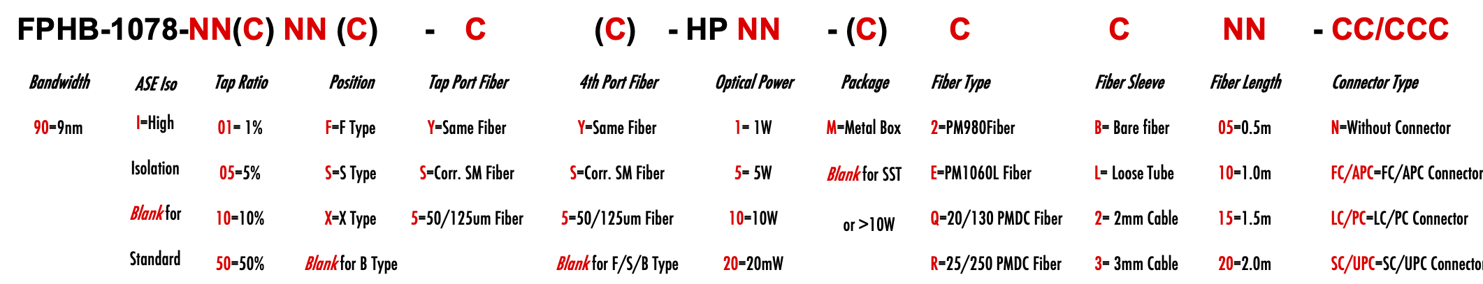FPHB 1078nm Singlemode PM Fiber Bandpass Filter Tap coupler splitter Hybrid Bandwidth 9.0nm 9nm optical fiber bandpass filter with tap coupler or splitter hybrid device or bandstop filter Glasfaser-Bandpassfilter mit Abzweigkoppler oder Splitter-Hybridgerät oder Bandsperrfilter Filtro de paso de banda de fibra óptica con acoplador de grifo o dispositivo híbrido divisor o filtro de banda filtre passe-bande à fibre optique avec coupleur de prise ou dispositif hybride séparateur ou filtre coupe-bande optinen kuitukaistanpäästösuodatin, jossa on väliliitin tai jakajahybridilaite tai kaistanstop-suodatin filtro passa-banda de fibra óptica com acoplador de torneira ou dispositivo híbrido divisor ou filtro de parada de banda ?wiat?owodowy filtr pasmowo-przepustowy z hybrydowym urz?dzeniem sprz?gaj?cym lub rozdzielaczem lub filtrem pasmowym optisk fiber båndpassfilter med tappkopler eller splitter hybridenhet eller båndstoppfilter filtro passa banda in fibra ottica con accoppiatore di presa o dispositivo ibrido sdoppiatore o filtro elimina banda glasvezelbanddoorlaatfilter met kraankoppeling of splitter hybride apparaat of bandstopfilter pásmový filtr s optickým vláknem s odbo?ovacím vazebním ?lenem nebo rozbo?ovacím hybridním za?ízením nebo pásmovým filtrem PM980 PM980XP PM980HP LMA 6/125um 10/125um 10/130um 12/130um 15/125um 15/130um 20/125um 20/130um 25/250um 30/250um SC Single Clad Cladding DC Double Clad or large mode area fiber fibre à simple gaine ou fibre à double gaine ou fibre à grande zone de mode ingle Clad-Faser oder Double Clad-Faser oder Large-Mode-Area-Faser ibra con revestimiento simple o fibra con revestimiento doble o fibra de área modal grande fibra de revestimento simples ou fibra de revestimento duplo ou fibra de área de modo grande ibra a rivestimento singolo o fibra a doppio rivestimento o fibra a grande area modale yksikerroksinen kuitu tai kaksinkertainen kuitu tai suurimuotoinen kuitu 2-port D Type 3-port Y Type 4-port X Type Type D à 2 ports Type Y à 3 ports Type X à 4 ports -Port-D-Typ 3-Port-Y-Typ 4-Port-X-Typ Tipo D de 2 puertos Tipo Y de 3 puertos Tipo X de 4 puertos Tipo D de 2 portas Tipo Y de 3 portas Tipo X de 4 portas ipo D a 2 porte Tipo Y a 3 porte Tipo X a 4 porte 2-porttinen D-tyyppi 3-porttinen Y-tyyppi 4-porttinen X-tyyppi Polarization Maintaining PM Extinction Ratio ER Panda tie maintien de la polarisation fibre panda ou cravate avec taux d'extinction polarisationserhaltende Panda- oder Bindefaser mit Extinktionsverhältnis polarización manteniendo panda o fibra de amarre con relación de extinción polarização mantendo a fibra panda ou tie com taxa de extinção polarizzazione mantenendo panda o legare fibra con rapporto di estinzione olarisaatiota ylläpitävä panda- tai sidekuitu ekstinktiosuhteella