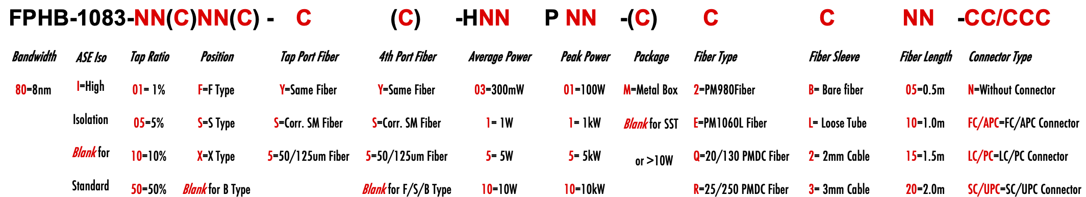 FPHB 1083nm Singlemode PM Fiber Bandpass Filter Tap coupler splitter Hybrid Bandwidth 8.0nm 8nm optical fiber bandpass filter with tap coupler or splitter hybrid device or bandstop filter Glasfaser-Bandpassfilter mit Abzweigkoppler oder Splitter-Hybridgerät oder Bandsperrfilter Filtro de paso de banda de fibra óptica con acoplador de grifo o dispositivo híbrido divisor o filtro de banda filtre passe-bande à fibre optique avec coupleur de prise ou dispositif hybride séparateur ou filtre coupe-bande optinen kuitukaistanpäästösuodatin, jossa on väliliitin tai jakajahybridilaite tai kaistanstop-suodatin filtro passa-banda de fibra óptica com acoplador de torneira ou dispositivo híbrido divisor ou filtro de parada de banda ?wiat?owodowy filtr pasmowo-przepustowy z hybrydowym urz?dzeniem sprz?gaj?cym lub rozdzielaczem lub filtrem pasmowym optisk fiber båndpassfilter med tappkopler eller splitter hybridenhet eller båndstoppfilter filtro passa banda in fibra ottica con accoppiatore di presa o dispositivo ibrido sdoppiatore o filtro elimina banda glasvezelbanddoorlaatfilter met kraankoppeling of splitter hybride apparaat of bandstopfilter pásmový filtr s optickým vláknem s odbo?ovacím vazebním ?lenem nebo rozbo?ovacím hybridním za?ízením nebo pásmovým filtrem PM980 PM980XP PM980HP LMA 6/125um 10/125um 10/130um 12/130um 15/125um 15/130um 20/125um 20/130um 25/250um 30/250um SC Single Clad Cladding DC Double Clad or large mode area fiber fibre à simple gaine ou fibre à double gaine ou fibre à grande zone de mode ingle Clad-Faser oder Double Clad-Faser oder Large-Mode-Area-Faser ibra con revestimiento simple o fibra con revestimiento doble o fibra de área modal grande fibra de revestimento simples ou fibra de revestimento duplo ou fibra de área de modo grande ibra a rivestimento singolo o fibra a doppio rivestimento o fibra a grande area modale yksikerroksinen kuitu tai kaksinkertainen kuitu tai suurimuotoinen kuitu 2-port D Type 3-port Y Type 4-port X Type Type D à 2 ports Type Y à 3 ports Type X à 4 ports -Port-D-Typ 3-Port-Y-Typ 4-Port-X-Typ Tipo D de 2 puertos Tipo Y de 3 puertos Tipo X de 4 puertos Tipo D de 2 portas Tipo Y de 3 portas Tipo X de 4 portas ipo D a 2 porte Tipo Y a 3 porte Tipo X a 4 porte 2-porttinen D-tyyppi 3-porttinen Y-tyyppi 4-porttinen X-tyyppi Polarization Maintaining PM Extinction Ratio ER Panda tie maintien de la polarisation fibre panda ou cravate avec taux d'extinction polarisationserhaltende Panda- oder Bindefaser mit Extinktionsverhältnis polarización manteniendo panda o fibra de amarre con relación de extinción polarização mantendo a fibra panda ou tie com taxa de extinção polarizzazione mantenendo panda o legare fibra con rapporto di estinzione olarisaatiota ylläpitävä panda- tai sidekuitu ekstinktiosuhteella