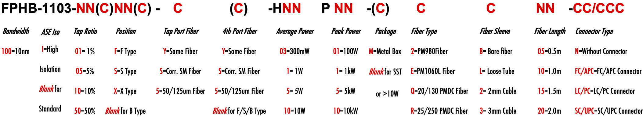 FPHB 1103nm Singlemode PM Fiber Bandpass Filter Tap coupler splitter Hybrid Bandwidth 10nm 10.0nm optical fiber bandpass filter with tap coupler or splitter hybrid device or bandstop filter Glasfaser-Bandpassfilter mit Abzweigkoppler oder Splitter-Hybridgerät oder Bandsperrfilter Filtro de paso de banda de fibra óptica con acoplador de grifo o dispositivo híbrido divisor o filtro de banda filtre passe-bande à fibre optique avec coupleur de prise ou dispositif hybride séparateur ou filtre coupe-bande optinen kuitukaistanpäästösuodatin, jossa on väliliitin tai jakajahybridilaite tai kaistanstop-suodatin filtro passa-banda de fibra óptica com acoplador de torneira ou dispositivo híbrido divisor ou filtro de parada de banda ?wiat?owodowy filtr pasmowo-przepustowy z hybrydowym urz?dzeniem sprz?gaj?cym lub rozdzielaczem lub filtrem pasmowym optisk fiber båndpassfilter med tappkopler eller splitter hybridenhet eller båndstoppfilter filtro passa banda in fibra ottica con accoppiatore di presa o dispositivo ibrido sdoppiatore o filtro elimina banda glasvezelbanddoorlaatfilter met kraankoppeling of splitter hybride apparaat of bandstopfilter pásmový filtr s optickým vláknem s odbo?ovacím vazebním ?lenem nebo rozbo?ovacím hybridním za?ízením nebo pásmovým filtrem PM980 PM980XP PM980HP LMA 6/125um 10/125um 10/130um 12/130um 15/125um 15/130um 20/125um 20/130um 25/250um 30/250um SC Single Clad Cladding DC Double Clad or large mode area fiber fibre à simple gaine ou fibre à double gaine ou fibre à grande zone de mode ingle Clad-Faser oder Double Clad-Faser oder Large-Mode-Area-Faser ibra con revestimiento simple o fibra con revestimiento doble o fibra de área modal grande fibra de revestimento simples ou fibra de revestimento duplo ou fibra de área de modo grande ibra a rivestimento singolo o fibra a doppio rivestimento o fibra a grande area modale yksikerroksinen kuitu tai kaksinkertainen kuitu tai suurimuotoinen kuitu 2-port D Type 3-port Y Type 4-port X Type Type D à 2 ports Type Y à 3 ports Type X à 4 ports -Port-D-Typ 3-Port-Y-Typ 4-Port-X-Typ Tipo D de 2 puertos Tipo Y de 3 puertos Tipo X de 4 puertos Tipo D de 2 portas Tipo Y de 3 portas Tipo X de 4 portas ipo D a 2 porte Tipo Y a 3 porte Tipo X a 4 porte 2-porttinen D-tyyppi 3-porttinen Y-tyyppi 4-porttinen X-tyyppi Polarization Maintaining PM Extinction Ratio ER Panda tie maintien de la polarisation fibre panda ou cravate avec taux d'extinction polarisationserhaltende Panda- oder Bindefaser mit Extinktionsverhältnis polarización manteniendo panda o fibra de amarre con relación de extinción polarização mantendo a fibra panda ou tie com taxa de extinção polarizzazione mantenendo panda o legare fibra con rapporto di estinzione olarisaatiota ylläpitävä panda- tai sidekuitu ekstinktiosuhteella