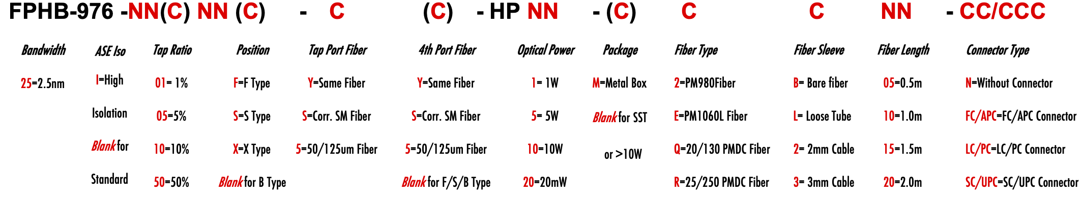 FPHB 976nm Singlemode PM Fiber Bandpass Filter Tap coupler splitter Hybrid Bandwidth 2.5nm optical fiber bandpass filter with tap coupler or splitter hybrid device or bandstop filter Glasfaser-Bandpassfilter mit Abzweigkoppler oder Splitter-Hybridgerät oder Bandsperrfilter Filtro de paso de banda de fibra óptica con acoplador de grifo o dispositivo híbrido divisor o filtro de banda filtre passe-bande à fibre optique avec coupleur de prise ou dispositif hybride séparateur ou filtre coupe-bande optinen kuitukaistanpäästösuodatin, jossa on väliliitin tai jakajahybridilaite tai kaistanstop-suodatin filtro passa-banda de fibra óptica com acoplador de torneira ou dispositivo híbrido divisor ou filtro de parada de banda ?wiat?owodowy filtr pasmowo-przepustowy z hybrydowym urz?dzeniem sprz?gaj?cym lub rozdzielaczem lub filtrem pasmowym optisk fiber båndpassfilter med tappkopler eller splitter hybridenhet eller båndstoppfilter filtro passa banda in fibra ottica con accoppiatore di presa o dispositivo ibrido sdoppiatore o filtro elimina banda glasvezelbanddoorlaatfilter met kraankoppeling of splitter hybride apparaat of bandstopfilter pásmový filtr s optickým vláknem s odbo?ovacím vazebním ?lenem nebo rozbo?ovacím hybridním za?ízením nebo pásmovým filtrem PM980 PM980XP PM980HP LMA 6/125um 10/125um 10/130um 12/130um 15/125um 15/130um 20/125um 20/130um 25/250um 30/250um SC Single Clad Cladding DC Double Clad or large mode area fiber fibre à simple gaine ou fibre à double gaine ou fibre à grande zone de mode ingle Clad-Faser oder Double Clad-Faser oder Large-Mode-Area-Faser ibra con revestimiento simple o fibra con revestimiento doble o fibra de área modal grande fibra de revestimento simples ou fibra de revestimento duplo ou fibra de área de modo grande ibra a rivestimento singolo o fibra a doppio rivestimento o fibra a grande area modale yksikerroksinen kuitu tai kaksinkertainen kuitu tai suurimuotoinen kuitu 2-port D Type 3-port Y Type 4-port X Type Type D à 2 ports Type Y à 3 ports Type X à 4 ports -Port-D-Typ 3-Port-Y-Typ 4-Port-X-Typ Tipo D de 2 puertos Tipo Y de 3 puertos Tipo X de 4 puertos Tipo D de 2 portas Tipo Y de 3 portas Tipo X de 4 portas ipo D a 2 porte Tipo Y a 3 porte Tipo X a 4 porte 2-porttinen D-tyyppi 3-porttinen Y-tyyppi 4-porttinen X-tyyppi Polarization Maintaining PM Extinction Ratio ER Panda tie maintien de la polarisation fibre panda ou cravate avec taux d'extinction polarisationserhaltende Panda- oder Bindefaser mit Extinktionsverhältnis polarización manteniendo panda o fibra de amarre con relación de extinción polarização mantendo a fibra panda ou tie com taxa de extinção polarizzazione mantenendo panda o legare fibra con rapporto di estinzione olarisaatiota ylläpitävä panda- tai sidekuitu ekstinktiosuhteella
