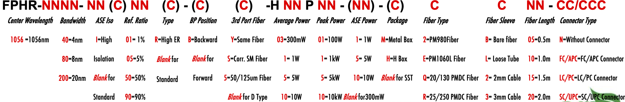 FPHR 1056nm Singlemode PM Fiber Bandpass Filter Tap coupler splitter Hybrid Bandwidth 4.0nm 8.0nm 20.0nm 4nm 8nm 20nm optical fiber bandpass filter with partial reflective fiber mirror or tap coupler or splitter hybrid device or bandstop filter filtre passe-bande à fibre optique avec miroir à fibre à réflexion partielle ou coupleur de prise ou dispositif hybride séparateur ou filtre coupe-bande Bandpassfilter aus optischen Fasern mit teilweise reflektierendem Faserspiegel oder Abzweigkoppler oder Splitter-Hybridgerät oder Bandsperrfilter filtro passa banda in fibra ottica con specchio in fibra riflettente parziale o accoppiatore a presa o dispositivo ibrido sdoppiatore o filtro elimina banda filtro passa-banda de fibra óptica com espelho de fibra reflexiva parcial ou acoplador de torneira ou dispositivo híbrido divisor ou filtro de parada de banda Filtro de paso de banda de fibra óptica con espejo de fibra reflectante parcial o acoplador de grifo o dispositivo híbrido divisor o filtro de parada de banda optinen kuitukaistanpäästösuodatin osittain heijastavalla kuitupeilillä tai hanan liittimellä tai jakajahybridilaitteella tai kaistanstop-suodattimella glasvezelbanddoorlaatfilter met gedeeltelijk reflecterende vezelspiegel of kraankoppeling of splitter hybride apparaat of bandstopfilter pásmový filtr s optickým vláknem s ?áste?ným reflexním vláknovým zrcadlem nebo odbo?ovací spojkou nebo rozbo?ovacím hybridním za?ízením nebo pásmovým filtrem ?wiat?owodowy filtr pasmowo-przepustowy z cz??ciowo odblaskowym lustrem ?wiat?owodowym lub hybrydowe urz?dzenie sprz?gaj?ce lub rozdzielaj?ce lub filtr pasmowy optisk fiber båndpassfilter med delvis reflekterende fiberspeil eller tappkobling eller splitter hybrid enhet eller båndstoppfilter PM980 PM980XP PM980HP LMA 6/125um 10/125um 10/130um 12/130um 15/125um 15/130um 20/125um 20/130um 25/250um 30/250um SC Single Clad Cladding DC Double Clad or large mode area fiber fibre à simple gaine ou fibre à double gaine ou fibre à grande zone de mode ingle Clad-Faser oder Double Clad-Faser oder Large-Mode-Area-Faser ibra con revestimiento simple o fibra con revestimiento doble o fibra de área modal grande fibra de revestimento simples ou fibra de revestimento duplo ou fibra de área de modo grande ibra a rivestimento singolo o fibra a doppio rivestimento o fibra a grande area modale yksikerroksinen kuitu tai kaksinkertainen kuitu tai suurimuotoinen kuitu 2-port D Type 3-port Y Type 4-port X Type Type D à 2 ports Type Y à 3 ports Type X à 4 ports -Port-D-Typ 3-Port-Y-Typ 4-Port-X-Typ Tipo D de 2 puertos Tipo Y de 3 puertos Tipo X de 4 puertos Tipo D de 2 portas Tipo Y de 3 portas Tipo X de 4 portas ipo D a 2 porte Tipo Y a 3 porte Tipo X a 4 porte 2-porttinen D-tyyppi 3-porttinen Y-tyyppi 4-porttinen X-tyyppi Polarization Maintaining PM Extinction Ratio ER Panda tie maintien de la polarisation fibre panda ou cravate avec taux d'extinction polarisationserhaltende Panda- oder Bindefaser mit Extinktionsverhältnis polarización manteniendo panda o fibra de amarre con relación de extinción polarização mantendo a fibra panda ou tie com taxa de extinção polarizzazione mantenendo panda o legare fibra con rapporto di estinzione olarisaatiota ylläpitävä panda- tai sidekuitu ekstinktiosuhteella