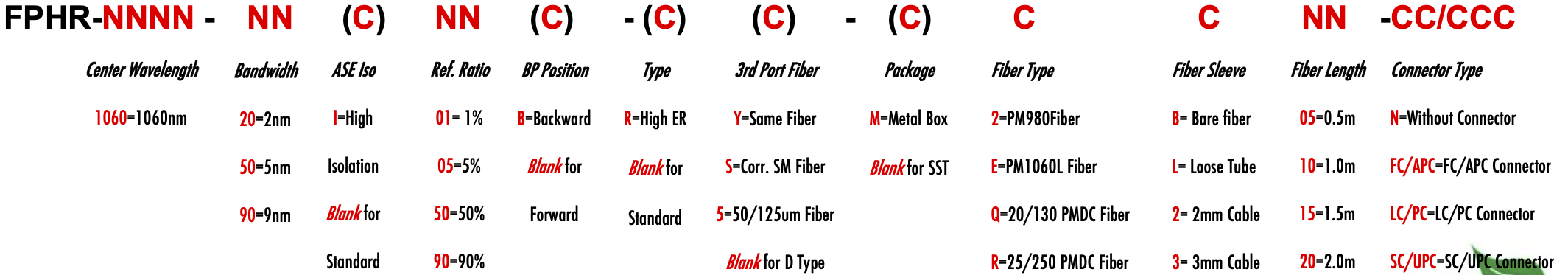 FPHR 1060nm Singlemode PM Fiber Bandpass Filter Tap coupler splitter Hybrid Bandwidth 2.0nm 5.0nm 9.0nm 2nm 5nm 9nm optical fiber bandpass filter with partial reflective fiber mirror or tap coupler or splitter hybrid device or bandstop filter filtre passe-bande à fibre optique avec miroir à fibre à réflexion partielle ou coupleur de prise ou dispositif hybride séparateur ou filtre coupe-bande Bandpassfilter aus optischen Fasern mit teilweise reflektierendem Faserspiegel oder Abzweigkoppler oder Splitter-Hybridgerät oder Bandsperrfilter filtro passa banda in fibra ottica con specchio in fibra riflettente parziale o accoppiatore a presa o dispositivo ibrido sdoppiatore o filtro elimina banda filtro passa-banda de fibra óptica com espelho de fibra reflexiva parcial ou acoplador de torneira ou dispositivo híbrido divisor ou filtro de parada de banda Filtro de paso de banda de fibra óptica con espejo de fibra reflectante parcial o acoplador de grifo o dispositivo híbrido divisor o filtro de parada de banda optinen kuitukaistanpäästösuodatin osittain heijastavalla kuitupeilillä tai hanan liittimellä tai jakajahybridilaitteella tai kaistanstop-suodattimella glasvezelbanddoorlaatfilter met gedeeltelijk reflecterende vezelspiegel of kraankoppeling of splitter hybride apparaat of bandstopfilter pásmový filtr s optickým vláknem s ?áste?ným reflexním vláknovým zrcadlem nebo odbo?ovací spojkou nebo rozbo?ovacím hybridním za?ízením nebo pásmovým filtrem ?wiat?owodowy filtr pasmowo-przepustowy z cz??ciowo odblaskowym lustrem ?wiat?owodowym lub hybrydowe urz?dzenie sprz?gaj?ce lub rozdzielaj?ce lub filtr pasmowy optisk fiber båndpassfilter med delvis reflekterende fiberspeil eller tappkobling eller splitter hybrid enhet eller båndstoppfilter PM980 PM980XP PM980HP LMA 6/125um 10/125um 10/130um 12/130um 15/125um 15/130um 20/125um 20/130um 25/250um 30/250um SC Single Clad Cladding DC Double Clad or large mode area fiber fibre à simple gaine ou fibre à double gaine ou fibre à grande zone de mode ingle Clad-Faser oder Double Clad-Faser oder Large-Mode-Area-Faser ibra con revestimiento simple o fibra con revestimiento doble o fibra de área modal grande fibra de revestimento simples ou fibra de revestimento duplo ou fibra de área de modo grande ibra a rivestimento singolo o fibra a doppio rivestimento o fibra a grande area modale yksikerroksinen kuitu tai kaksinkertainen kuitu tai suurimuotoinen kuitu 2-port D Type 3-port Y Type 4-port X Type Type D à 2 ports Type Y à 3 ports Type X à 4 ports -Port-D-Typ 3-Port-Y-Typ 4-Port-X-Typ Tipo D de 2 puertos Tipo Y de 3 puertos Tipo X de 4 puertos Tipo D de 2 portas Tipo Y de 3 portas Tipo X de 4 portas ipo D a 2 porte Tipo Y a 3 porte Tipo X a 4 porte 2-porttinen D-tyyppi 3-porttinen Y-tyyppi 4-porttinen X-tyyppi Polarization Maintaining PM Extinction Ratio ER Panda tie maintien de la polarisation fibre panda ou cravate avec taux d'extinction polarisationserhaltende Panda- oder Bindefaser mit Extinktionsverhältnis polarización manteniendo panda o fibra de amarre con relación de extinción polarização mantendo a fibra panda ou tie com taxa de extinção polarizzazione mantenendo panda o legare fibra con rapporto di estinzione olarisaatiota ylläpitävä panda- tai sidekuitu ekstinktiosuhteella