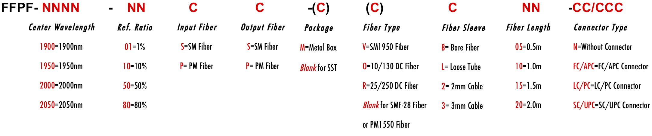 FFPF 2000nm 1970nm 2030nm 1975nm 1980nm 1985nm 1990nm 1995nm 2005nm 2010nm 2015nm 2020nm 2025nm Partial Reflective Fiber Mirror Polarization Insensitive Teilweise reflektierende Faserspiegelpolarisation unempfindlich Polarizzazione parziale dello specchio in fibra riflettente insensibile Parcial reflectante de fibra espejo polarización insensible Polarização reflexiva parcial do espelho de fibra insensível Miroir à fibre réfléchissante partielle insensible à la polarisation Osittain heijastava kuitupeili, polarisaatio herkkä SMF-28 SMF28 SM1950 PM1950 PM1550 LMA 8/125um 10/125um 10/130um 20/125um 20/130um 25/250um SC Single Clad PMSC Cladding DC PMDC Double Clad Polarization Maintaining PM Extinction Ratio ER Panda