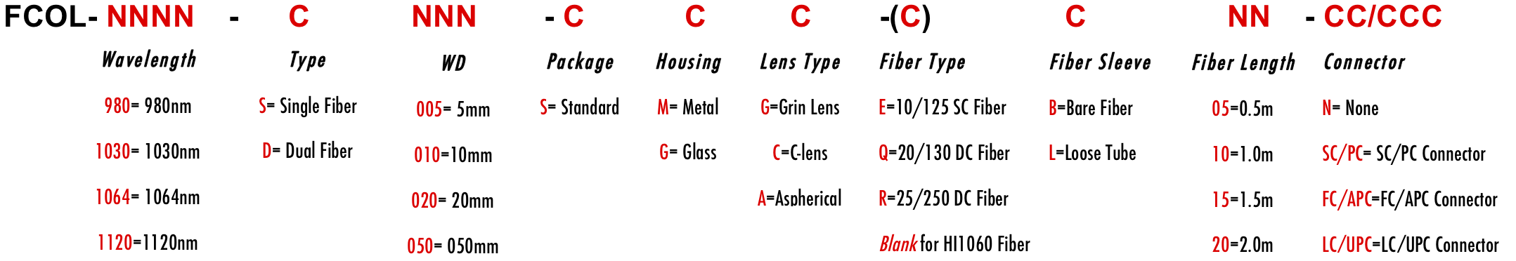 FCOL 1070nm 1050nm 1090nm 1053nm 1055nm 1056nm 1060nm 1063nm 1064nm 1065nm 1075nm 1080nm 1083nm 1085nm polarization insensitive optical fiber collimator with collimated gaussian beam for free space output or space doublet to collect light from free space with Grin lens C spherical lens and aspherical lens colimador de fibra óptica insensible a la polarización con haz gaussiano colimado para salida de espacio libre o doblete espacial para recoger luz del espacio libre con lente esférica C y lente asférica de lente Grin colimador de fibra óptica insensível à polarização com feixe gaussiano colimado para saída de espaço livre ou dupleto de espaço para coletar luz do espaço livre com lente Grin lente esférica C e lente asférica polarisaatioherkkä optisen kuidun kollimaattori, jossa on kollimoitu gaussinen säde vapaan tilan tuottamiseksi tai avaruusdubletti valon keräämiseksi vapaasta tilasta Grin-linssin pallomaisella linssillä ja asfäärisellä linssillä polarisationsunempfindlicher Lichtleiterkollimator mit kollimiertem Gaußschen Strahl für die Ausgabe im freien Raum oder Raumdublett zum Sammeln von Licht aus dem freien Raum mit der sphärischen Linse C und der asphärischen Linse der Grin-Linse C Collimateur à fibre optique insensible à la polarisation avec faisceau gaussien collimaté pour une sortie d'espace libre ou doublet d'espace pour collecter la lumière de l'espace libre avec lentille Grin C lentille sphérique et lentille asphérique kolimator ?wiat?owodowy niewra?liwy na polaryzacj? ze skolimowan? wi?zk? Gaussa zapewniaj?c? wyj?cie w wolnej przestrzeni lub dublet kosmiczny do zbierania ?wiat?a z wolnej przestrzeni za pomoc? soczewki sferycznej Grin C i soczewki asferycznej collimatore in fibra ottica insensibile alla polarizzazione con fascio gaussiano collimato per l'uscita nello spazio libero o doppietto nello spazio per raccogliere la luce dallo spazio libero con lente Grin C lente sferica e lente asferica HI1060 1060XP LMA 6/125um 10/125um 10/130um 12/125um 12/130um 15/125um 15/130um 20/125um 20/130um 25/250um 30/250um SC Single Clad Cladding DC Double Clad 3-port Y Type