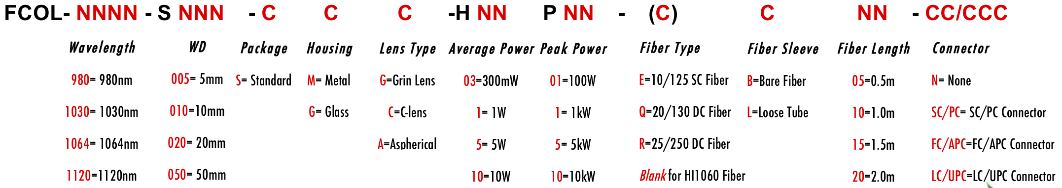 FCOL 1103nm 1080nm 1123nm 1083nm 1085nm 1090nm 1092nm 1095nm 1100nm 1105nm 1110nm 1115nm 1120nm polarization insensitive optical fiber collimator with collimated gaussian beam for free space output or space doublet to collect light from free space with Grin lens C spherical lens and aspherical lens colimador de fibra óptica insensible a la polarización con haz gaussiano colimado para salida de espacio libre o doblete espacial para recoger luz del espacio libre con lente esférica C y lente asférica de lente Grin colimador de fibra óptica insensível à polarização com feixe gaussiano colimado para saída de espaço livre ou dupleto de espaço para coletar luz do espaço livre com lente Grin lente esférica C e lente asférica polarisaatioherkkä optisen kuidun kollimaattori, jossa on kollimoitu gaussinen säde vapaan tilan tuottamiseksi tai avaruusdubletti valon keräämiseksi vapaasta tilasta Grin-linssin pallomaisella linssillä ja asfäärisellä linssillä polarisationsunempfindlicher Lichtleiterkollimator mit kollimiertem Gaußschen Strahl für die Ausgabe im freien Raum oder Raumdublett zum Sammeln von Licht aus dem freien Raum mit der sphärischen Linse C und der asphärischen Linse der Grin-Linse C Collimateur à fibre optique insensible à la polarisation avec faisceau gaussien collimaté pour une sortie d'espace libre ou doublet d'espace pour collecter la lumière de l'espace libre avec lentille Grin C lentille sphérique et lentille asphérique kolimator ?wiat?owodowy niewra?liwy na polaryzacj? ze skolimowan? wi?zk? Gaussa zapewniaj?c? wyj?cie w wolnej przestrzeni lub dublet kosmiczny do zbierania ?wiat?a z wolnej przestrzeni za pomoc? soczewki sferycznej Grin C i soczewki asferycznej collimatore in fibra ottica insensibile alla polarizzazione con fascio gaussiano collimato per l'uscita nello spazio libero o doppietto nello spazio per raccogliere la luce dallo spazio libero con lente Grin C lente sferica e lente asferica HI1060 1060XP LMA 6/125um 10/125um 10/130um 12/125um 12/130um 15/125um 15/130um 20/125um 20/130um 25/250um 30/250um SC Single Clad Cladding DC Double Clad 3-port Y Type
